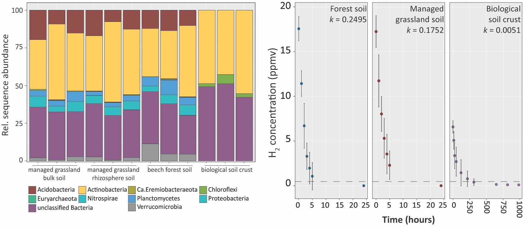 Microorganisms are responsible for the uptake of atmospheric H2 through the activity of high-affinity enzymes, such as the group 1h [NiFe]-hydrogenase4. Significant rates of atmospheric H2 consumption have been observed in temperate soils such as forests, grasslands and pasture soils, due to the activity of these high-affinity enzymes4. Various taxonomic groups have been implicated in this atmospheric H2 consumption5, one of them being members of the phylum Acidobacteria.
