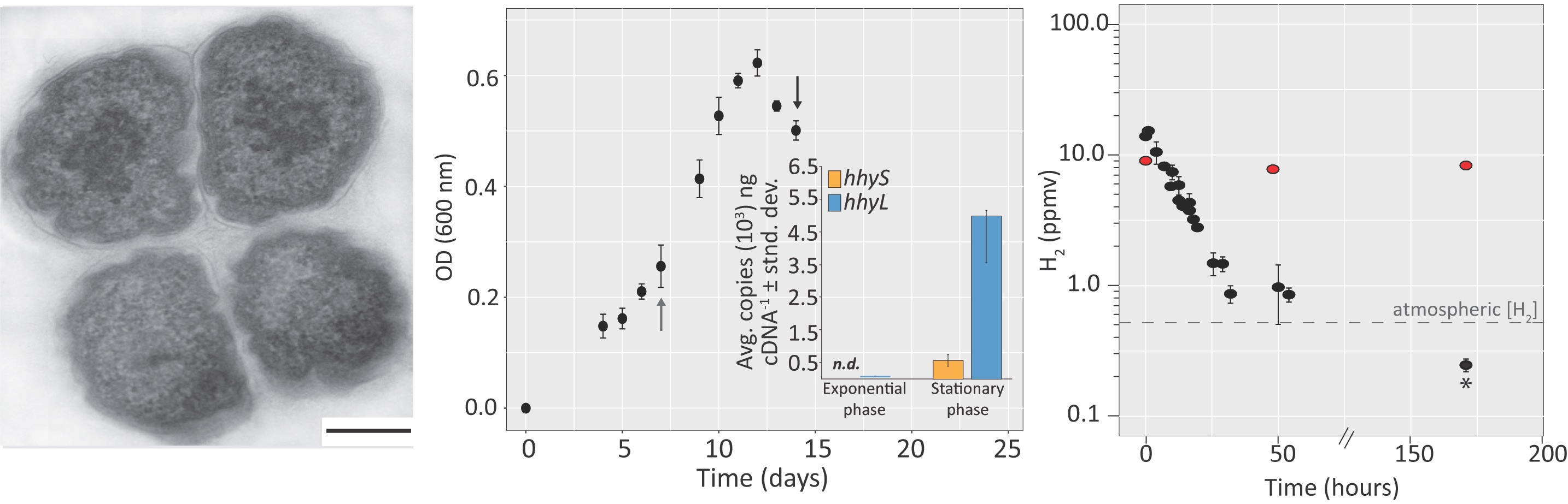Soils harbor a diverse collection of microorganisms with estimates of 109-1010 cells per gram of soil, and within that gram containing upwards of 1,000 species. Yet the majority (estimates of up to ~80%) of these microorganisms are in a state of non-growth or dormancy for extended periods of time1. Atmospheric gas scavenging is proposed to be a strategy to survive these periods of non-growth2, presumably stemming from carbon deprivation. As such soils are often referred to as “sinks” for atmospheric gases3, namely molecular hydrogen (H2).