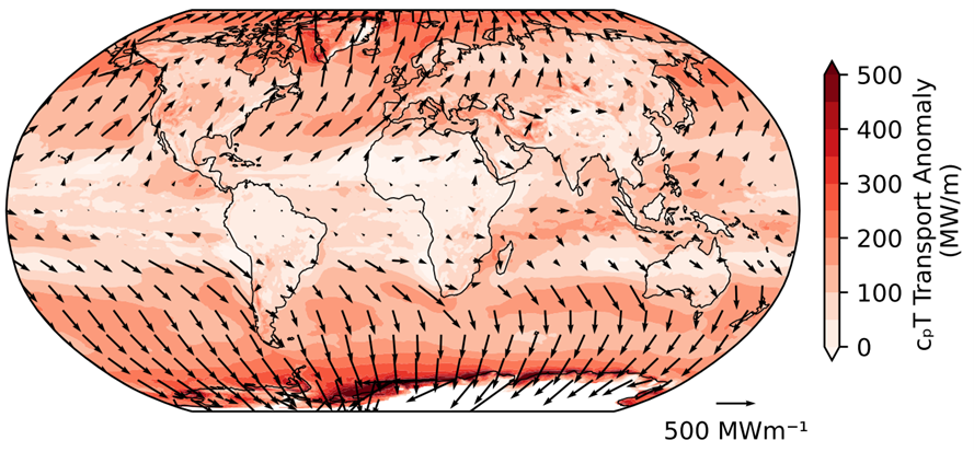 Atmospheric rivers (ARs) are long filaments of intense water vapor transport in the lower atmosphere. These long, narrow corridors carry moisture from the humid tropics to the drier midlatitudes and polar regions, and often cause extreme precipitation events when they make landfall. Our recent study finds that, in addition to transporting moisture, ARs also transport large quantities of heat worldwide. This causes warm temperature anomalies at the surface, as well as being linked to extreme temperature anomalies and humid heat waves.