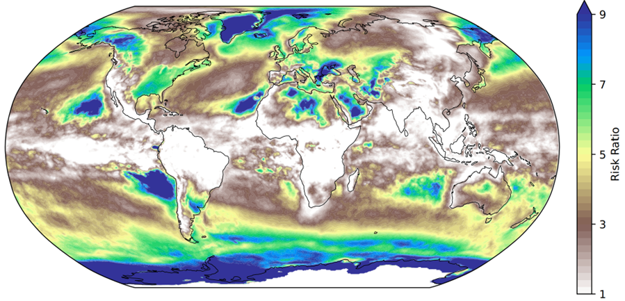 Due to these effects, more frequent atmospheric river events are associated with warmer-than-average winters throughout much of the midlatitudes. In addition, we find that ARs are associated with the majority of extreme hourly temperature excursions in many regions: this means that if you experience anomalously warm winter air temperatures in eastern North American or western Europe, there is a >70% chance you are within an AR. Risk ratios show that extreme temperature anomalies in these regions are 7 times more likely to occur within ARs than would be expected if the events were independent, and these values are even higher in the polar regions (Figure 3).