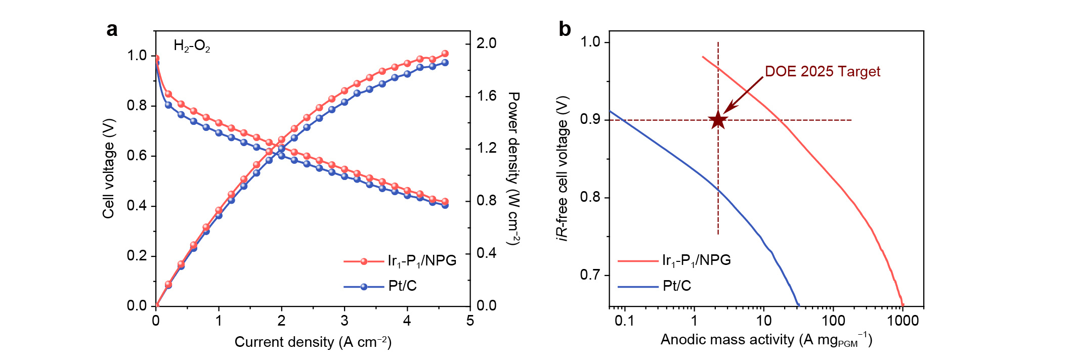 The HOR performance of Ir1-P1/NPG and Ir1/NG were evaluated in both H2-saturated aqueous 0.1 M HClO4 and 0.1 M KOH on a rotating disk electrode (RDE). Typical HOR polarization curves with constant diffusion-limited currents are observed for Ir1-P1/NPG, whereas Ir1/NG exhibits negligible HOR activities. Through fitting the kinetic current densities in alkaline electrolyte, we find that the exchange current density of Ir1-P1/NPG is not only about three times and one order of magnitude greater than that for Pt/C and Ir/C with the same PGM loading amount, but also stands at the top level among the state-of-the-art HOR catalysts that have been reported so far. More importantly, the performance of our Ir1-P1/NPG catalyst as the anode for PEMFC is unprecedented (Fig. 3): the anodic mass activity at 0.9 ViR-free reaches 17.11 A mgPGM−1, which is nearly eight times higher than the U.S. Department of Energy (DOE) 2025 target.