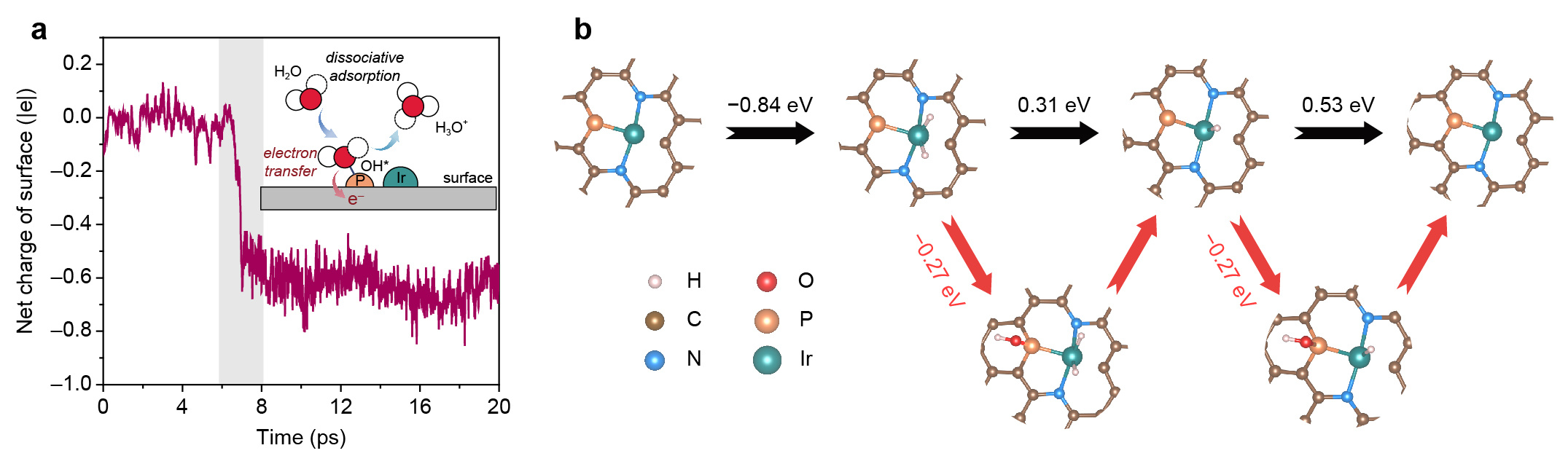 By selectively poisoning Ir and P sites, the HOR activities of Ir1-P1/NPG were significantly suppressed, indicating the indispensable role of both Ir and P for HOR. Besides the hydrogen adsorption energy determined by Ir atoms, it was interesting to note that there were hydroxyl species (OH*) adsorbed on P sites during HOR, observed in quasi in-situ XPS spectra. Mulliken charge analysis also showed that such adsorption of OH* on P was indeed a proton-coupled electron transfer step evidenced by an accumulation of −0.7|e| on catalyst's surface (Fig. 4a). Thus, in the OH*-participated HOR route, the explicit electron transfer step occurs on the oxidative adsorption of OH* rather than the desorption of H*. To determine whether OH* adsorbed on P sites could participate in electrochemical reaction, we performed CO stripping test with and without quenching P sites, revealing that it is the OH* adsorbed on P sites that oxidatively reacts with CO. As a result, it is plausible to propose a bifunctional HOR mechanism over integrative Ir1-P1 CPs, that is, HOR occurs through dissociative adsorption of H2 on Ir sites followed by combination with the reactive OH* adsorbed on the adjacent P sites (Fig. 4b).