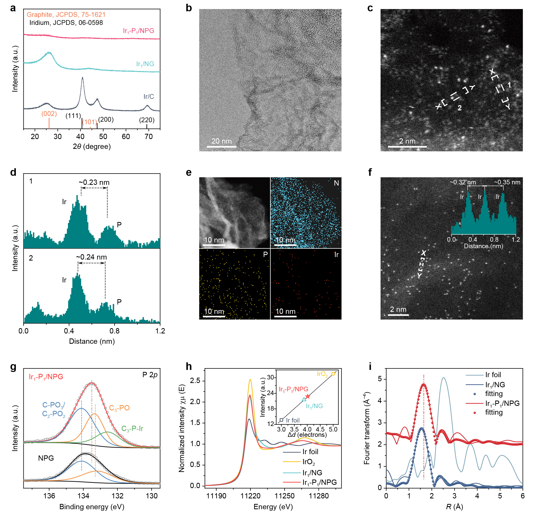 To provide sufficient evidence to justify the atomic dispersion and interaction between Ir and P, we firstly performed XRD, survey XPS and EDS measurements to identify the elemental compositions of our catalysts. Then, through comparing HAADF-STEM images (including their element-specific electron scattering cross-sections) and quantitative STEM simulations of Ir1/NG and Ir1-P1/NPG, atomically dispersed pairs of Ir and P could be identified in Ir1-P1/NPG. Furthermore, the coordination interaction between paired Ir and P atoms in Ir1-P1/NPG was verified by P 2p XPS, EXAFS fitting as well as PDOS analysis (Fig. 2).