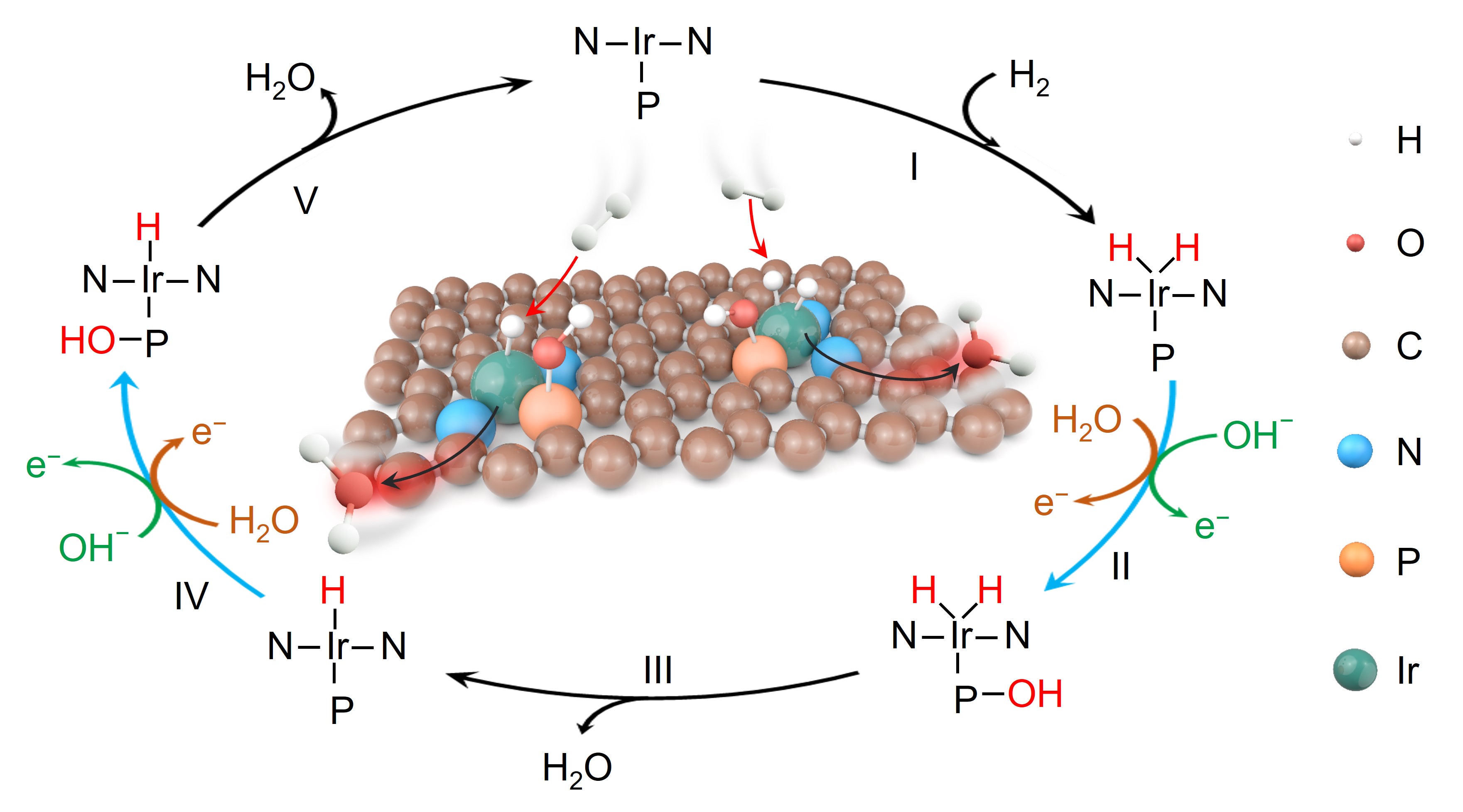 In this study, Prof. Bin Liu's group at City University of Hong Kong proposes a novel catalyst design principle of integrating paired metal–nonmetal active atoms for the first time, which introduces another reactive intermediate and induces an alternative reaction pathway to achieve an impossible catalysis process into reality on single-metal-atom catalysts. As a proof-of-concept, we construct atomically dispersed iridium and phosphorus pairs (Ir1-P1/NPG) and realize efficient and durable HOR performance, whereas the counterparts with only single-atom Ir (Ir1/NG) or P (NPG) are completely inert. A series of control experiments in conjunction with spectroscopic measurements unveil that the reactive hydroxyl (OH*) adsorbed on the more oxophilic P atomic site promotes the kinetics of H* desorption (Fig. 1). Theoretical calculations further demonstrate that the formation of H2O from OH* and H* on adjacent P and Ir atoms is indeed a thermodynamic redox process, which can be activated by ambient temperature without additional requirement of applied overpotential.