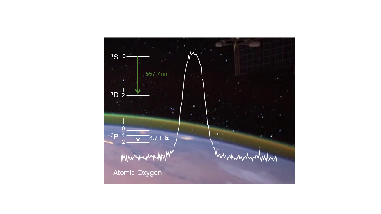 We have explored an alternative approach, namely the observation of the ground state fine-structure transition of atomic oxygen at 4.7 THz (63 µm, 3P1 -> 3P2 transition, see inset) with high spectra resolution. Since the populations of the states involved in this transition are purely determined by temperature and quantum mechanics the derivation of of the atomic oxygen concentration from the measured profiles is rather direct. The line profile of the emission is Doppler broadened and varies between approximately 10 and 30 MHz depending on the altitude from where the emission originates. This means that the altitude information of the atomic oxygen concentration is contained in the line profile.