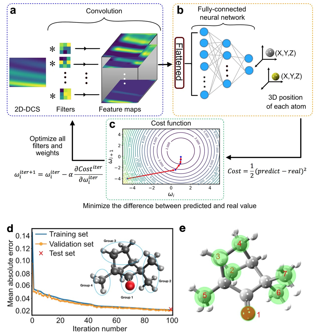 Fig. 1 Extracted (+)-Fenchone molecular structure. (a)The diffraction pattern (two-dimensional differential cross-section, 2D-DCS) is convolved with different filters to produce an ensemble of feature maps. (b) The feature maps are first flattened into a one-dimensional array and multiplied by the weights between each neuron of all layers in the fully-connected neural network to predict each atomic position in the molecule. (c) A schematic contour plot of the cost function with two weights. (d) Comparison between training and validation set for a subset of molecular voluminal. (e) Extracted (+)-Fenchone molecular structure of the measurement. Green circles represent uncertain areas.