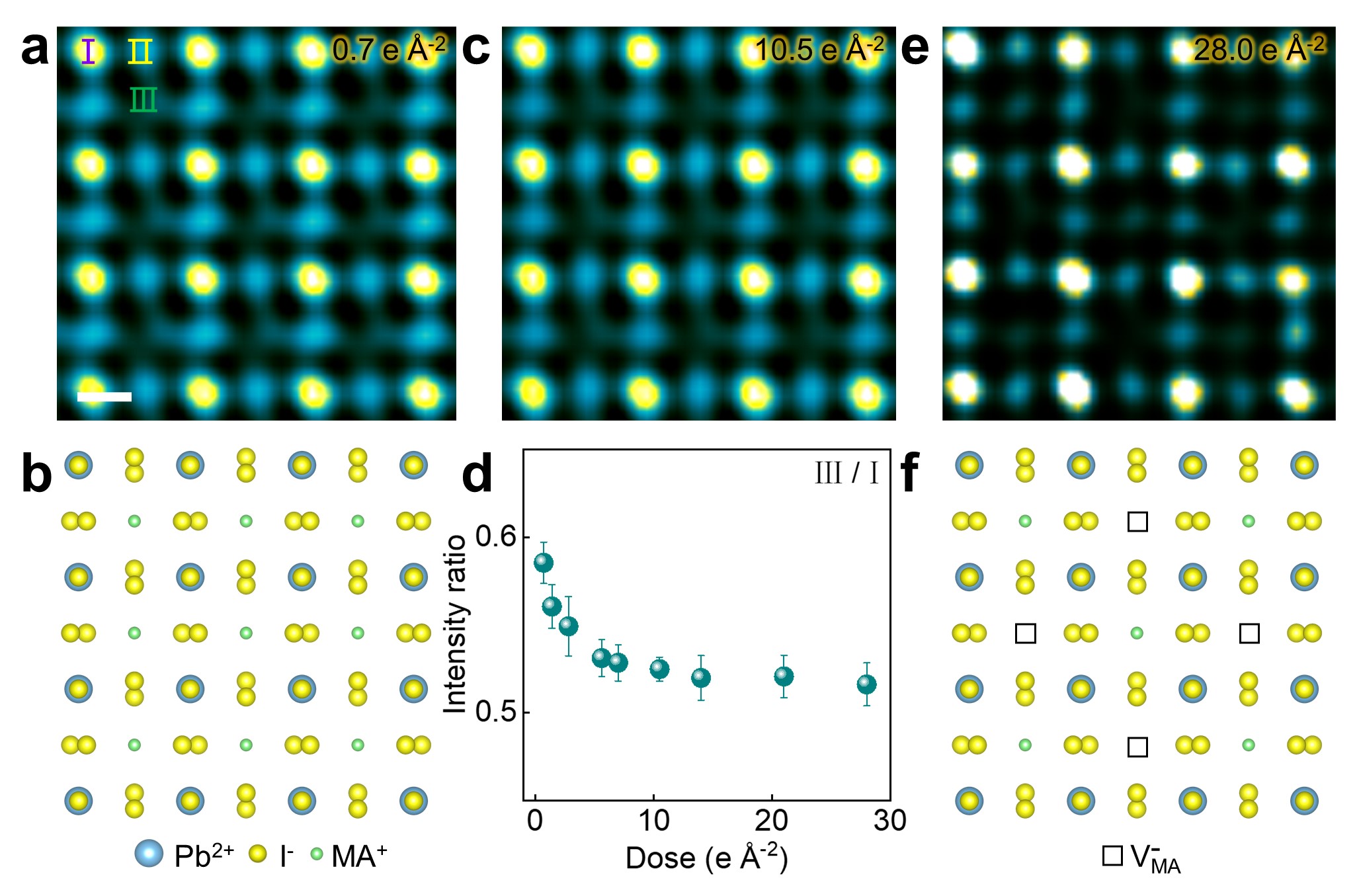 Fig. 1 Atomic-imaging of loss of MA+ and intermediate phase. a HRTEM image acquired at 0.7 e Å-2. ‘Ⅰ’, ‘Ⅱ’ and ‘Ⅲ’ columns correspond to Pb2+-I-, I-, and MA+ columns respectively. Scale bar, 3 Å. b Structural model of tetragonal MAPbI3. c HRTEM image acquired at 10.5 e Å-2. d Intensity ratio of ‘Ⅲ’ to ‘Ⅰ’ atomic column with increased doses. Nine data points of ‘Ⅲ’ and ‘Ⅰ’ type columns are used to obtain nine intensity ratios at each dose. The error bar represents standard deviation. e HRTEM image acquired at 28.0 e Å-2. f Structural model of MA0.5PbI3. The squares indicate . Taken from Nature communications (https://www.nature.com/articles/s41467-021-25832-9).