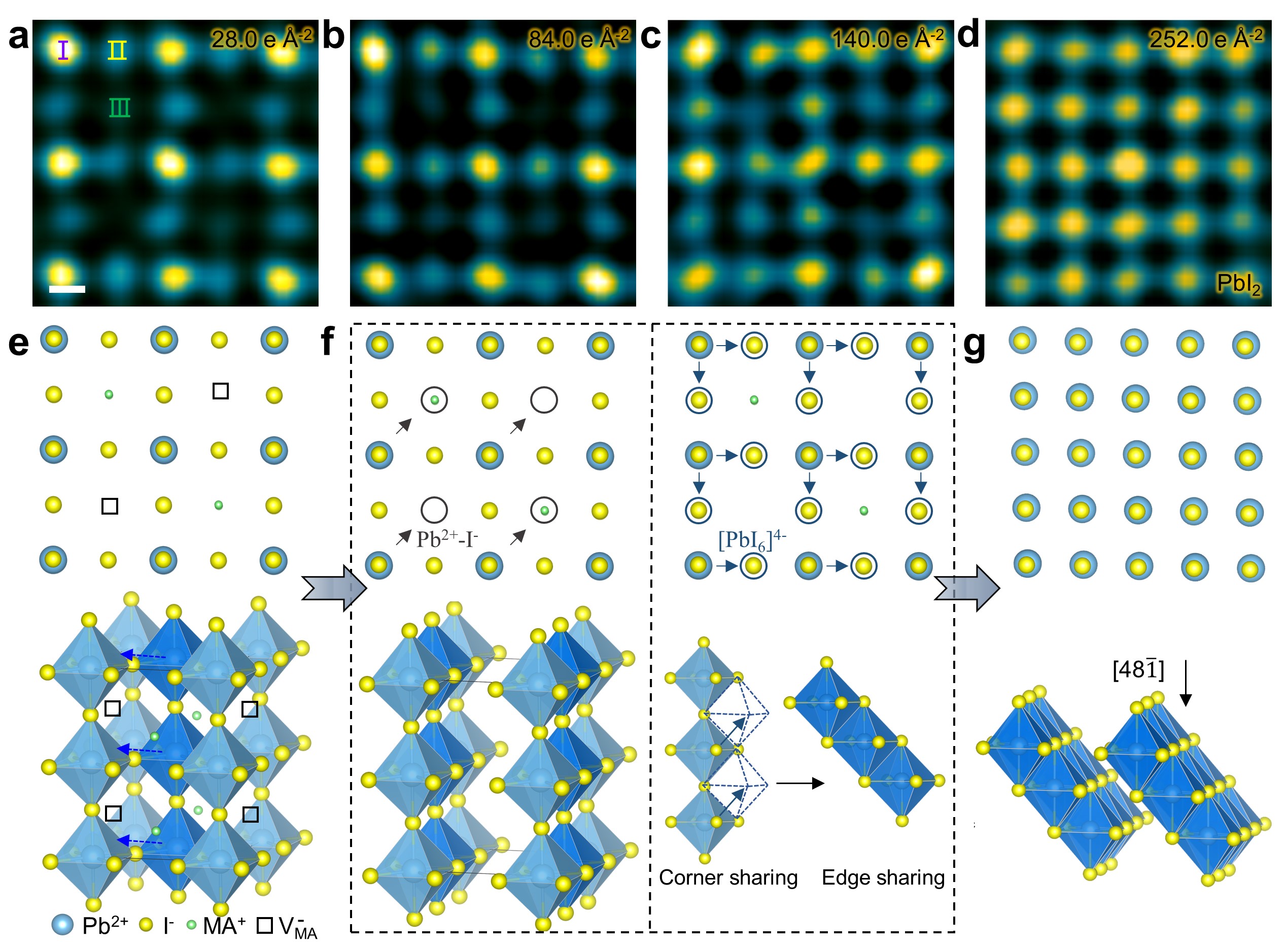 Fig. 2 Atomic-scale imaging the decomposition pathway. a-d HRTEM images with increased doses during the degradation into PbI2. The corresponding doses are marked on each panel. Scale bar, 2 Å. e Atomic structure of MA0.5PbI3. Black squares indicate . f Atomic structures to illustrate two kinds of I- and Pb2+ diffusion. Left panel shows I- and Pb2+ diffusing to while the right panel illustrates the [PbI6]4- octahedron slipping from corner sharing to edge sharing. g Atomic structure of final product PbI2. Taken from Nature communications (https://www.nature.com/articles/s41467-021-25832-9).