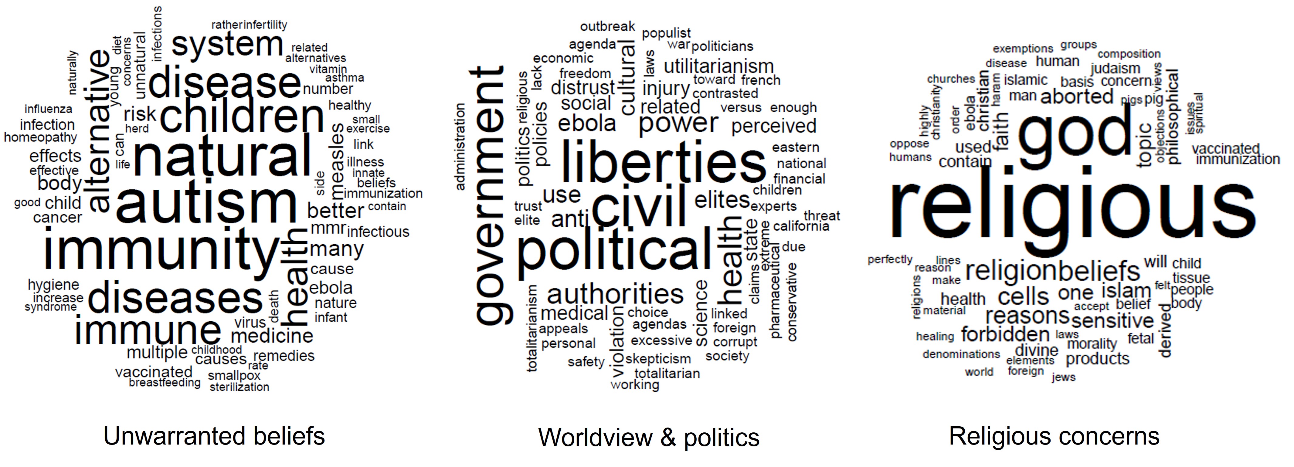 In an article just published in Nature Human Behaviour by our team, we reviewed decades of academic literature - including 152 papers and over 2,000 arguments - and narrowed down a set of eleven attitude roots relevant to understanding the motivations to reject vaccination. Using natural language processing methods, we were also able to predict the presence of these roots in a set of 582 false claims about vaccines made on social media. As an example, these three word clouds illustrate the content of anti-vaccination arguments that were classified to three attitude roots.