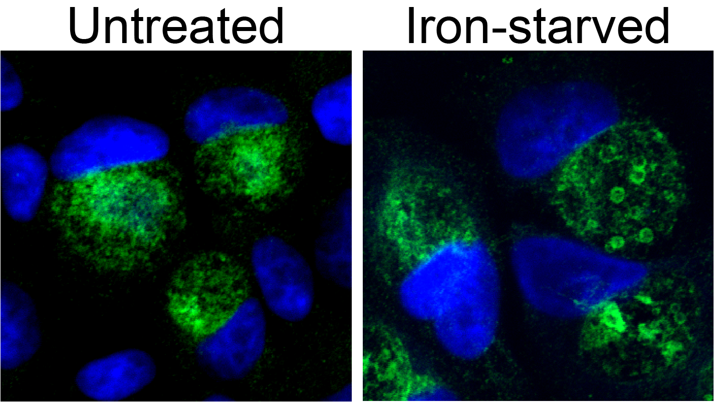 Figure 1: Persistence in Chlamydia trachomatis is characterized by morphologically aberrant bacteria that display dysregulated gene expression. Depicted in the right panel are persistent C. trachomatis following treatment with the membrane permeable iron chelator 2,2-bipyridyl (unpublished data). Indirect immunofluorescent confocal microscopy was used to detect C. trachomatis Hsp60 (green) while DNA is visualized by DAPI (blue).