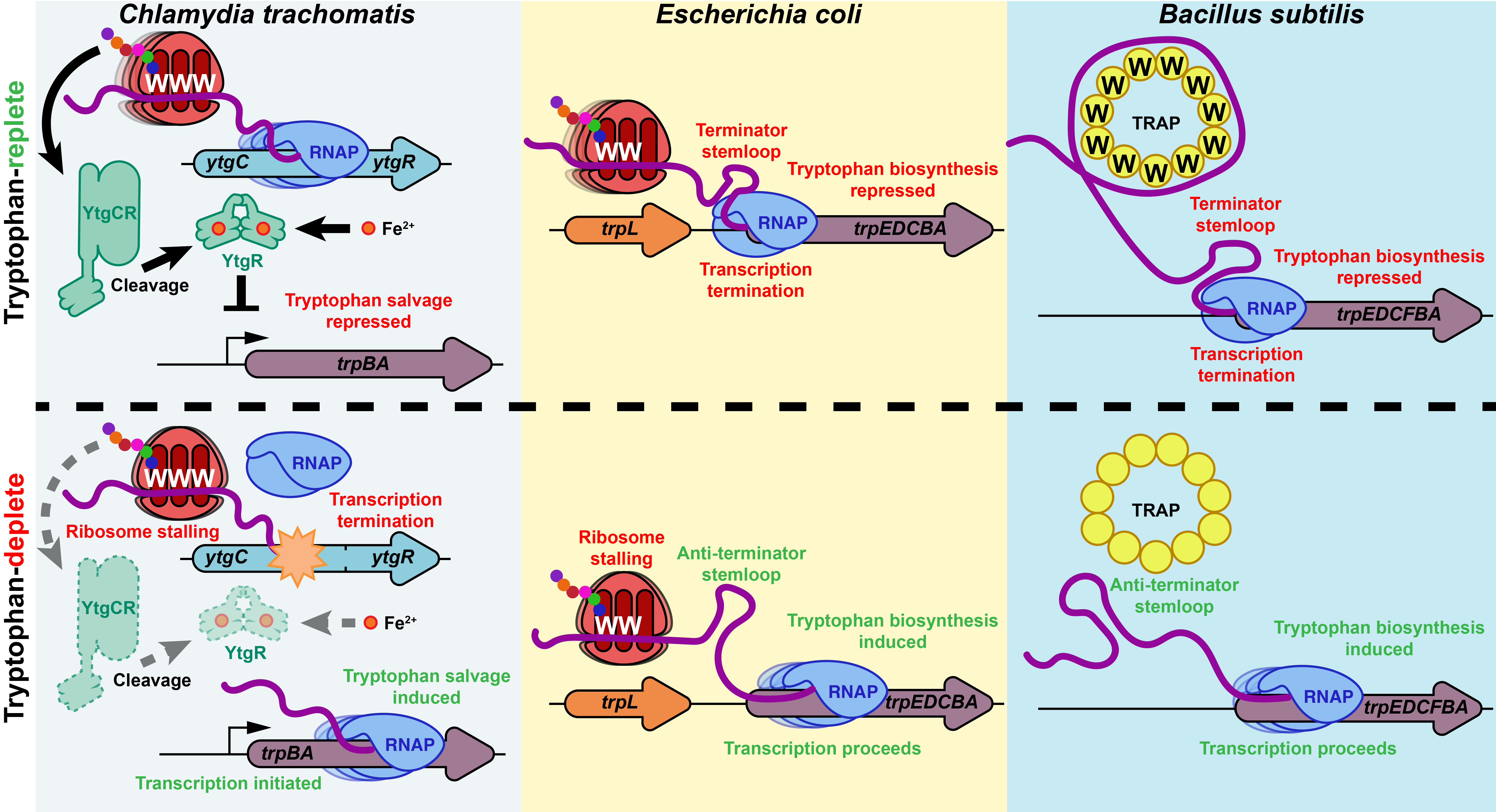 YtgR is unique in that it is encoded as the C-terminal domain of a divalent cation permease, YtgC, from which it must be cleaved during infection to act as a transcription factor. This also implies that the successful translation of YtgC is a prerequisite for YtgR expression and thus its regulatory activity. We observed that YtgC has a motif of three sequential tryptophan codons (WWW), resembling the characteristic WW motif in TrpL, the classic tryptophan-dependent cis-attenuator of bacterial trp operons. Therefore, we hypothesized that this motif may act to sensitize YtgR expression to the availability of tryptophan. We have now shown that the WWW motif regulates YtgR expression at both the level of transcription and translation. This leads to the up-regulation of trpBA transcription from the YtgR-regulated promoter element for trpBA. We propose that YtgR may exemplify a new class of trp operon transcription attenuators in bacteria that signal through a trans-acting transcription factor as opposed to the secondary structure of the nascent RNA of the trp operon (Figure 2). Additionally, we suspect that this may offer Chlamydia a possible means to integrate its transcriptional stress response to iron and tryptophan limitation, two stressors that induce persistence in vitro. The last transcription attenuator mechanism, TRAP in B. subtilis, was first described over 25 years ago. YtgR thus presents an intriguing update on this classic mechanism of transcription regulation. Click here for the full description of our results.