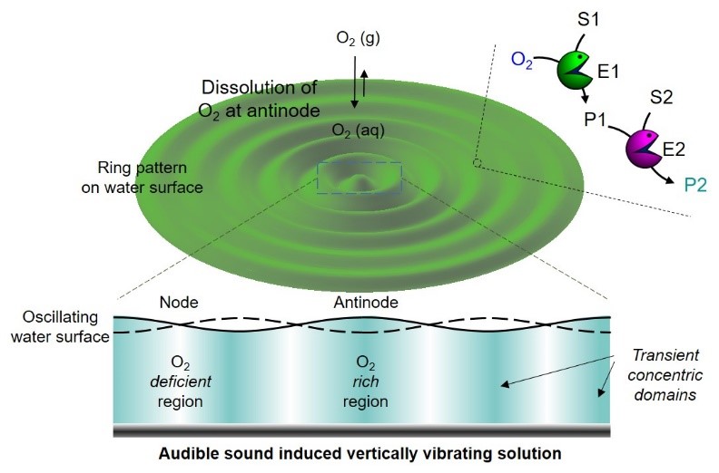 We noticed the creation of transient domains well-separated by an invisible wall at the nodal regions of the surface waves while dealing with liquid vibrations caused by sound. These spatiotemporal domains behave as “pseudo-compartments” while the invisible walls act as “pseudo-barriers”. The domains can be utilized to control enzyme-based cascade reactions in a region-specific fashion. We took advantage of the fact that oxygen in the air gets dissolved faster in the antinodal regions below the surface waves (Figure 1).