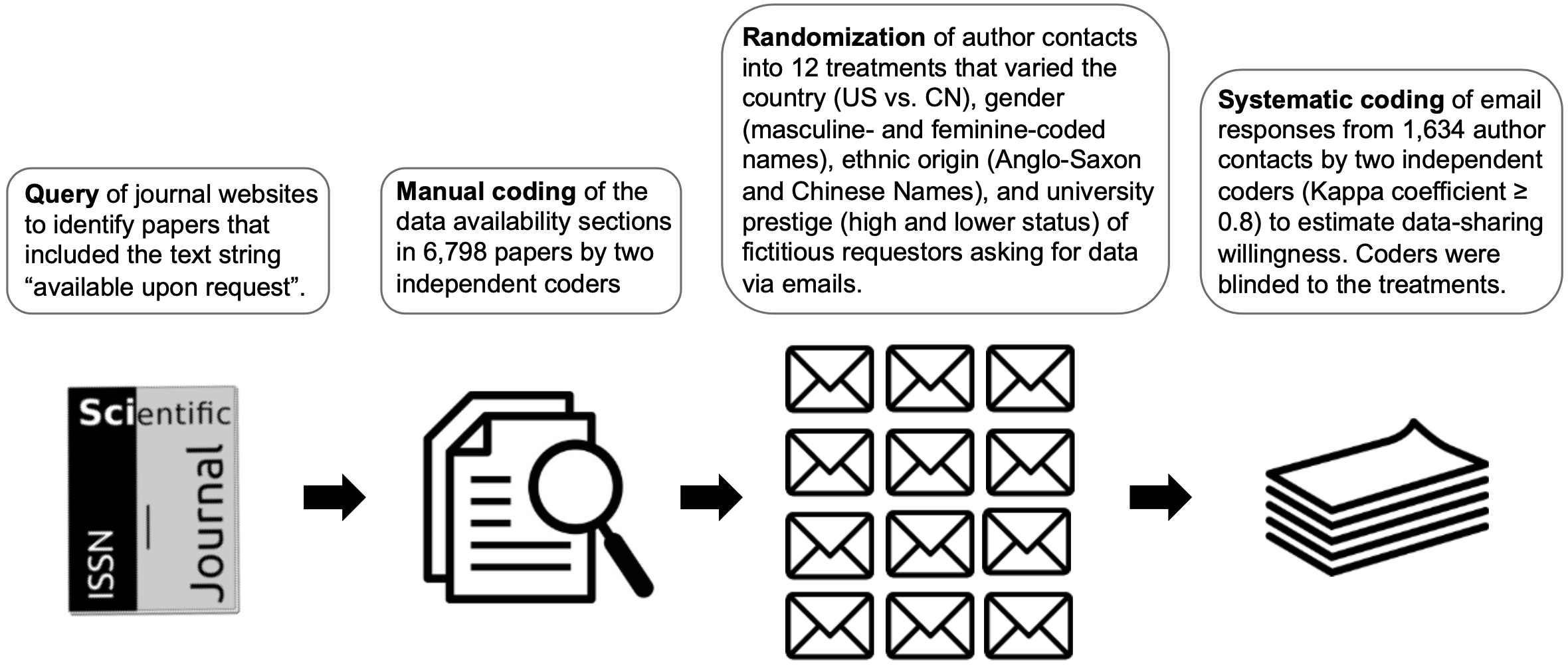 Our sample covered 1,634 authors of papers in diverse scientific fields who had indicated that their data was available upon request. We contacted all participants via email, using fictional ‘about to become’ PhD-student personas to request data related to a specific publication. To test for possible biases, we varied the identity of the data requestor on four factors: (1) country of residence (China vs. United States), (2) institutional prestige (high-status vs. lower-status university), (3) ethnicity (putatively Chinese vs. putatively Anglo-Saxon), and (4) gender (masculine-coded vs. feminine-coded name). With these manipulations it was possible to signal the fictitious requestors’ country of residence, university affiliation, perceived ethnicity, and gender.