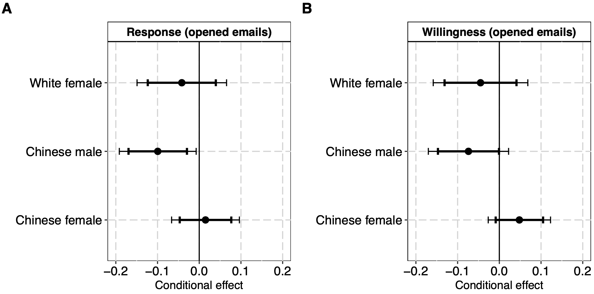 Figure 3| Conditional effects of Ethnicity and Gender on responsiveness and data-sharing willingness. The two panels display the effects for White female, Chinese male and Chinese female requestors compared to White male requestors.