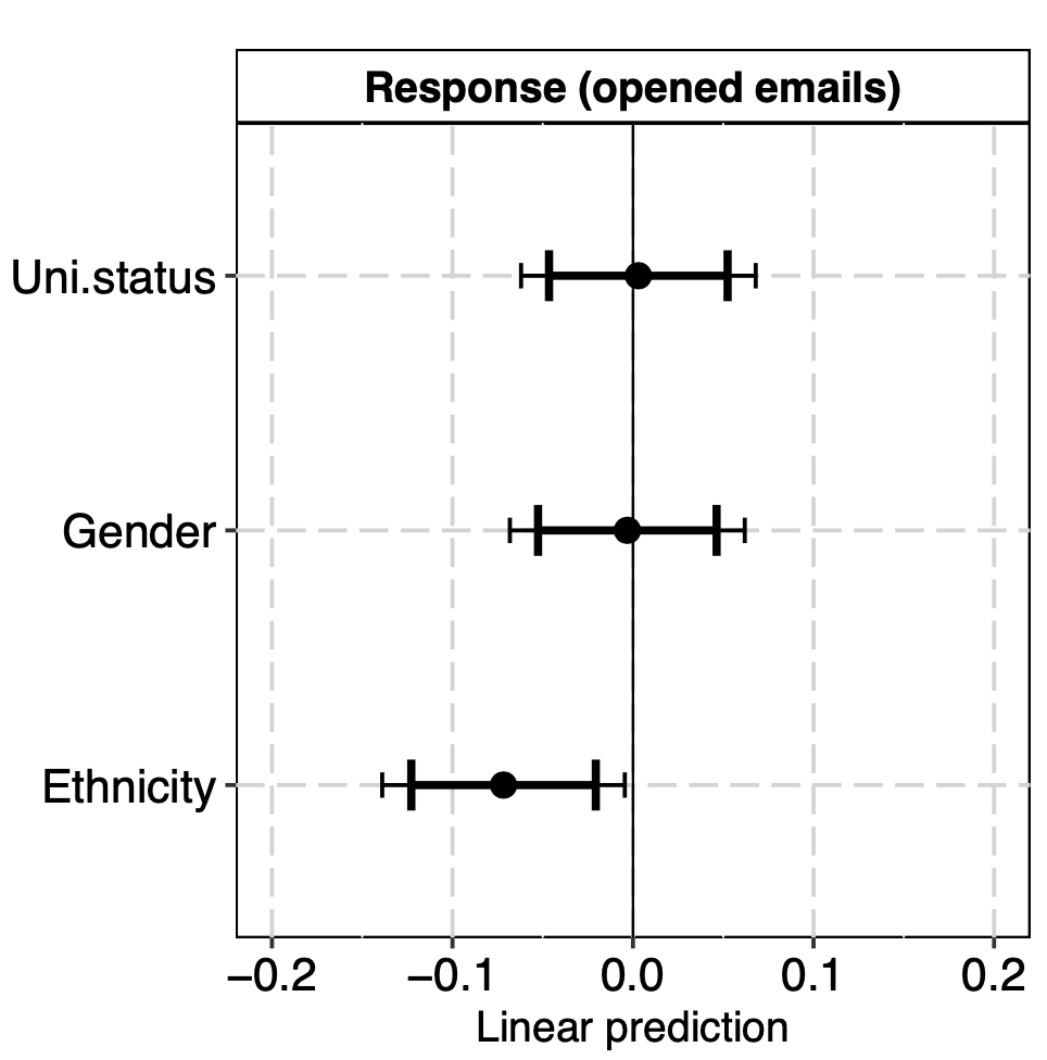 This type of ethnic bias may be more likely to occur at the initial stage of a data exchange when scientists make rapid and unreflective judgments on whether to engage with a requestor or not. In comparison, we found weak and statistically inconclusive evidence of ethnic bias in scientists’ willingness to share their data (inferred from a systematic coding of participants’ email responses).