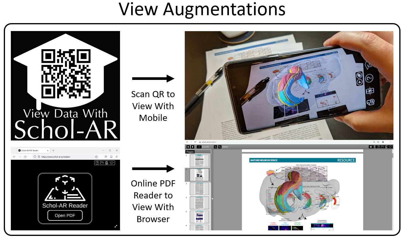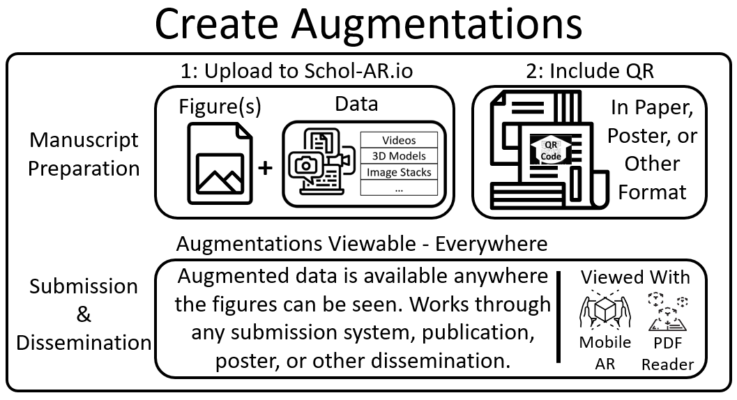 Fortunately, several technologies have recently become available that enable a solution that was not previously possible. Specifically, the global adoption of smartphones, emergence of consumer grade augmented reality and native browser integration of the web graphics library (WebGL) now make it possible to merge modern digital data directly with standard scientific communications. With this combination of technologies, we can ‘attach’ augmented digital media directly to figures, allowing readers to quickly access them through their smartphones, or standard computer screens, whichever they prefer.