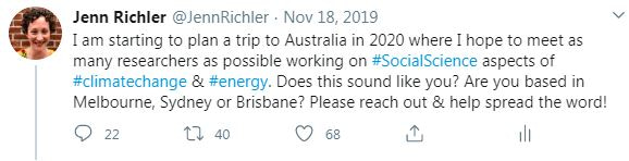The goal of my trip was to meet as many researchers as possible in Australia -- especially those I’d never interacted with before as reviewers or authors -- working on projects relevant to my editorial remit at Nature Climate Change and Nature Energy. This means anyone working on social science research with a behavioural component that has a climate change or energy angle. Learning about many different disciplines has been one of my favorite parts of this job, but the scope of what I cover presents a major challenge for setting up university visits. I can’t organize my trips around visiting specific departments, like for instance Psychology or Political Science Departments, because not every psychologist or political scientist does research of relevance to my journals; I can’t just target Environmental Studies departments, because not all members of such departments are social scientists.