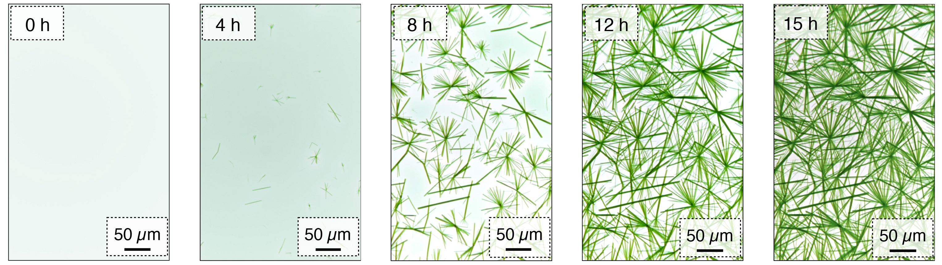 Why does SF-ASP proceed in such perfect autocatalytic manner? As illustrated in Fig. 2, the cross-sectional fibre ends preorganize the PN molecules via H-bonding interactions, thereby facilitating their efficient reductive cyclotetramerization into PC. Then, a new set of PN molecules can likewise be preorganized on the newly formed cross-sectional fibre end. Repetition of this sequence of elementary steps results in fibre elongation. We monitored the above process (Fig. 3) and found that fibres emerged 3–4 hours after heating, and then continuously elongated and increased in their number and thickness over a further period of 4 hours. Thereafter, the formation of new crystalline fibres subsided, but the formed fibres continued growing thicker, increasing the total cross-sectional area, and thereby further promoting the chemical transformation of PN into PC. In other words, PC is continuously produced, without product inhibition, at the cross-sectional fibre ends until PN is completely consumed. Equally important, end-to-end coupling of the crystalline fibres, which would result in a decrease in the total cross-sectional area for templating the reaction, barely occurred in SF-ASP, likely due to their very sluggish diffusion in the hot melt of PN under solvent-free conditions.