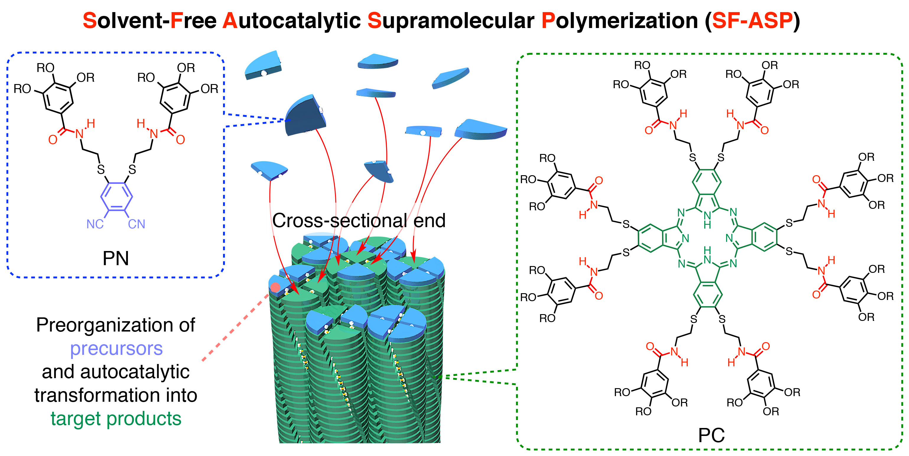 In our recent work, we provide a clearer solution. The solvent-free autocatalytic supramolecular polymerization (SF-ASP; Fig. 2) reported here provides an inhibition-free template-assisted catalytic organic transformation that takes great advantage of the fact that the product (template) undergoes a termination-free nucleation-elongation assembly (living supramolecular polymerization) under solvent-free conditions. The monomers for SF-ASP are phthalocyanine (PC) derivatives, which are produced via reductive cyclotetramerization of their phthalonitrile (PN) precursors that adopt a fan shape with hydrogen-bonding (H-bonding) amide groups. In SF-ASP, any PC monomer produced nucleates and initiates H-bonding-mediated supramolecular polymerization to give one-dimensional single-crystalline fibres, which can preorganize PN molecules via an H-bonding interaction at the cross-sectional fibre end and efficiently template their reductive cyclotetramerization to give PC in very high yield (>80%). With metal oleates, SF-ASP produces single-crystalline fibres of metallophthalocyanines, again in exceptionally high yields, which grow in both directions, without terminal coupling, until PN precursors are completely consumed. By taking advantage of the living nature of this polymerization, multistep SF-ASP with and without metal oleates allows for the precision synthesis of multi-block supramolecular copolymers.