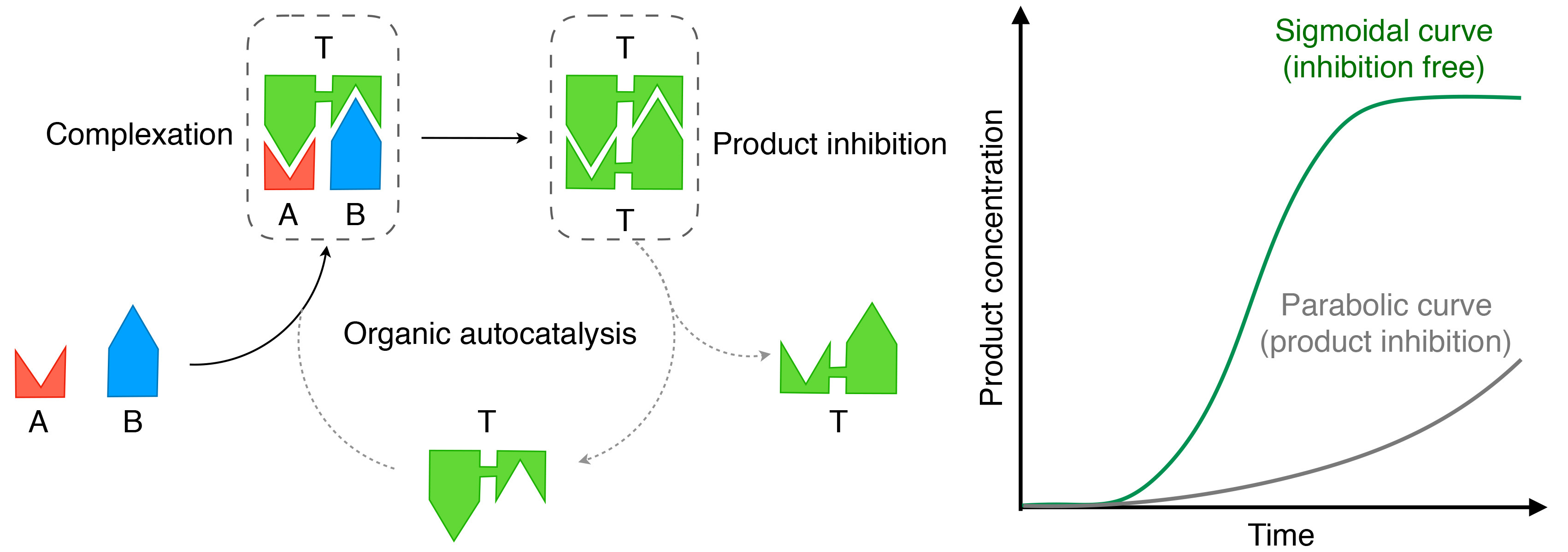 Scientists have long tried, using diverse strategies, to achieve autocatalysis in chemical transformations. Consider for example (Fig. 1), a reaction product designed to serve as a template (T) that can reversibly preorganize reactants A and B in the form of a ternary complex [A•T•B]. This facilitates the reaction between A and B to produce T•T. However, if T•T does not serve as a template, the expected autocatalytic behaviour would not emerge unless T•T dissociates into monomeric T. This is so called "product inhibition". Such decrease in active template concentration due to product inhibition and/or template aggregation is an essential problem in nonbiological organic autocatalysis and usually disturbs the expected sigmoidal time-course profile (Fig. 1). On the contrary, inorganic redox chemistry may involve inhibition-free autocatalysis, with the famous Belousov-Zhabotinsky chemical oscillator being a notable example. We also know that inorganic nanocrystals form in an inhibition-free autocatalytic manner, where precursor metal ions in aqueous media preferentially adsorb onto the surface of seed nanocrystals and are electronically reduced to become a part of the growing nanocrystals.