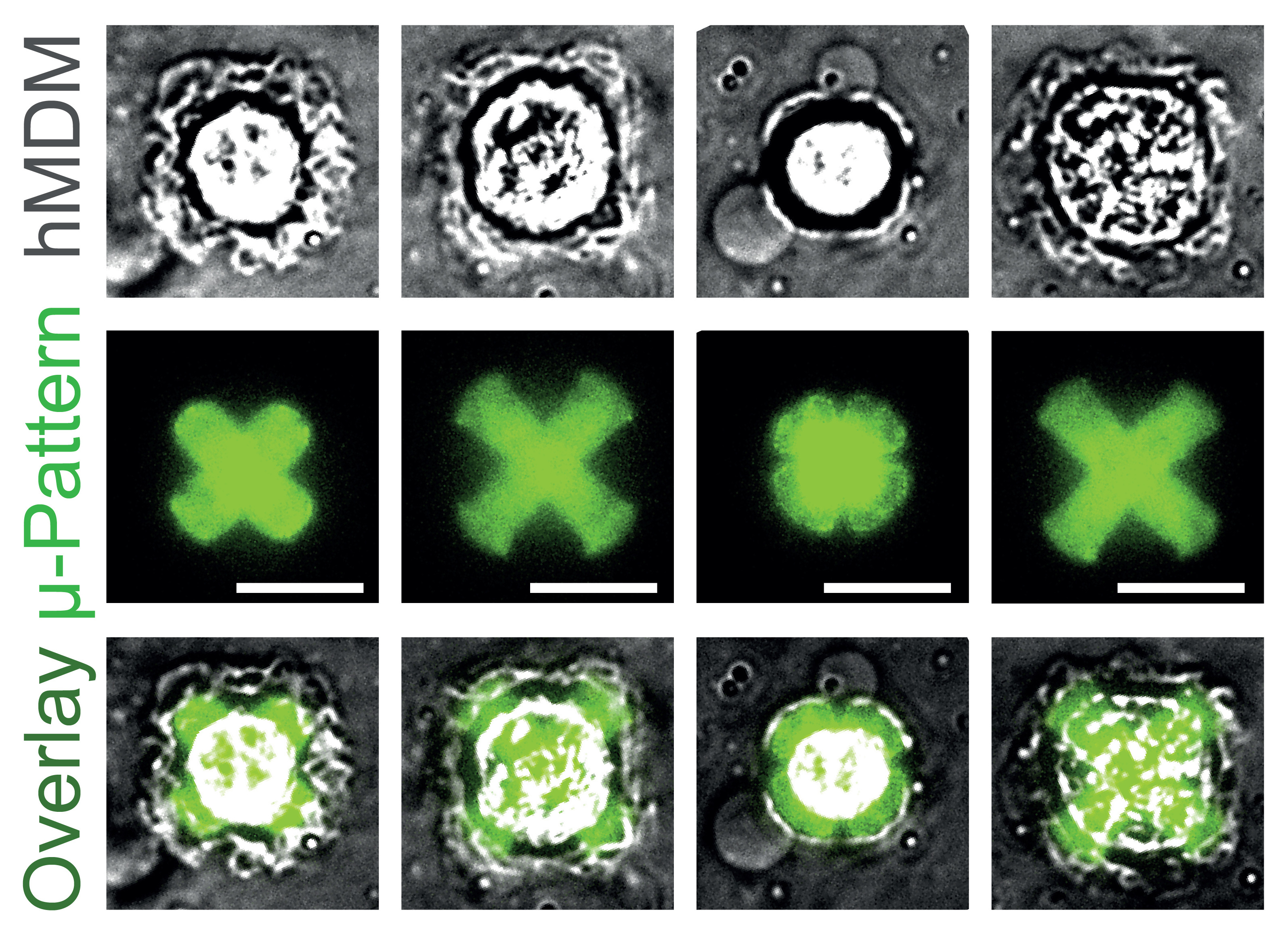 Fig. 1: Representative images of human monocyte-derived macrophage (isolated from donor blood and differentiated) adhering to ‘X’ shaped patterns presenting chimeric human antibody. A range phagocytic forces is observed. Figure is reproduced from Fig.6a of the manuscript.