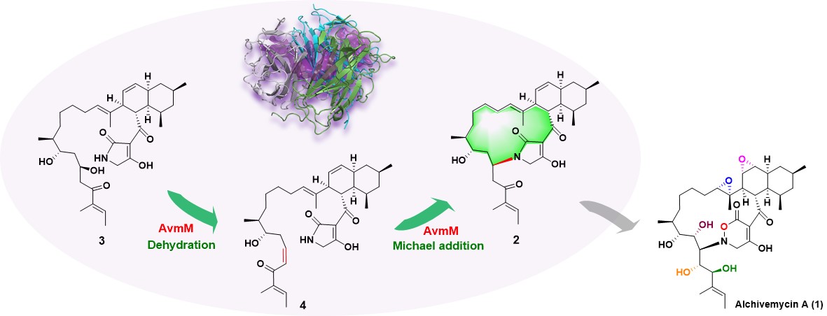 Fig. 1 AvmM catalyzes macrocycle formation in alchivemycin A biosynthesis.