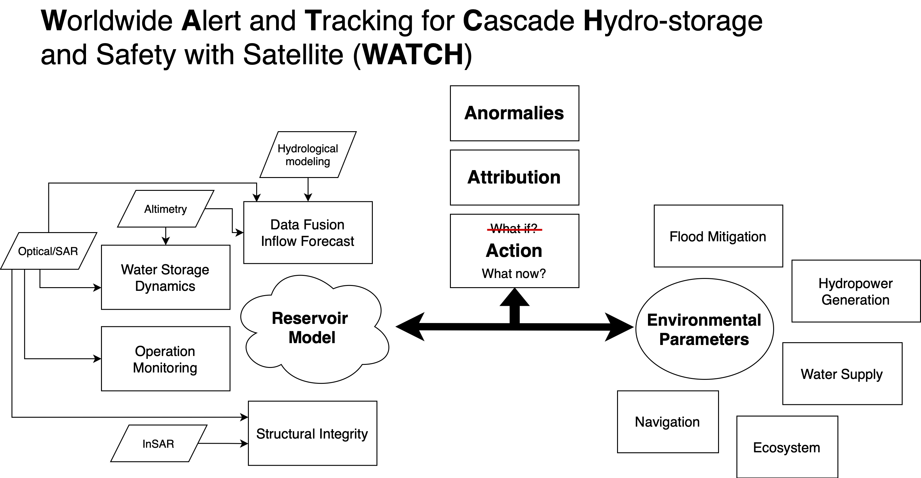 We propose a new system, named WATCH (Figure 1). This system integrates cutting-edge techniques for simulating river inflow and water system dynamics, as well as monitoring infrastructure operation and structural integrity. By fusing modeling and remote sensing, we can achieve comprehensive assessments even when conventional access is restricted. The core of WATCH is to encode the 'AAA' questions into software, enhancing better decision-making to protect the sustainability of our water systems.