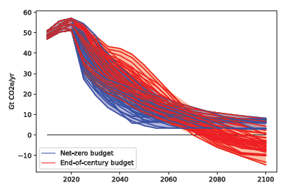 Figure 1. Emissions in all scenarios where warming is 2°C or below. Red lines show are scenarios with overshoot and net negative emissions; blue lines show net-zero-budget scenarios with little or no overshoot.