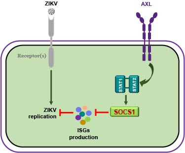 The first experiment in our study led to nothing surprising but confirmed that knockout of AXL could prevent ZIKV infection in astrocytes. However, subsequent viral entry studies showed that ZIKV could be internalized into AXL knockout astrocytes with a similar efficiency to that in unmodified astrocytes. An even more interesting result came from the analyses of the expression of IFNs and ISGs. We found that compared to unmodified cells, AXL knockout astrocytes exhibited more rapid and more prominent up-regulation of IFNs and ISGs in response to ZIKV infection. All these data together suggest that AXL is unlikely to function as a receptor for ZIKV in astrocytes. Instead, AXL acts as a signaling molecule.