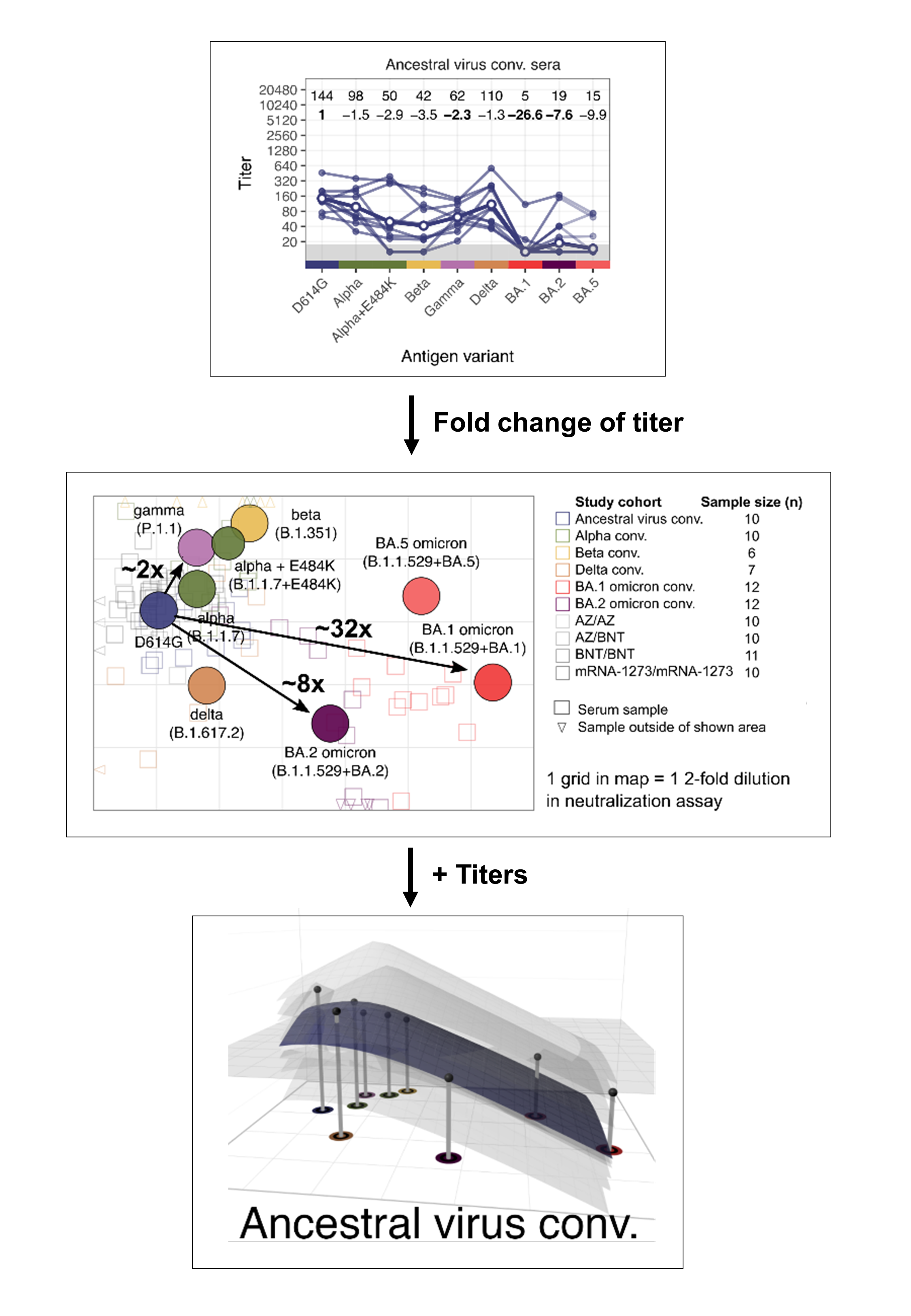 Given the rapid evolution of SARS-CoV-2 during it’s nearly three years of circulation within humans, a key question was whether infection/vaccination with one variant would protect against the others or more general how antigenically related the individual variants are to each other. This very question, but with respect to Influenza virus, has been a main research focus in the Smith’s group (Centre for Pathogen Evolution, Cambridge University) for years. Naturally, we thought that antigenic cartography, which proved to represent the antigenic relationships between influenza strains well2, could be an useful tool to understand the relationships of evolving SARS-CoV-2 strains. In brief, antigenic cartography is a method to visualize antibody neutralization titers against multiple variants in different serum cohorts in 2D, in a so-called antigenic map (see figure scheme). More antigenically similar variants will be close to each other on the map, while variants that induce no or only low levels of cross-neutralizing antibodies will be further apart. Crucial for a reliable map, however, is that it is created from single exposure sera, as cross-reactivity after exposure to multiple variants overshadows the underlying antigenic relationships.