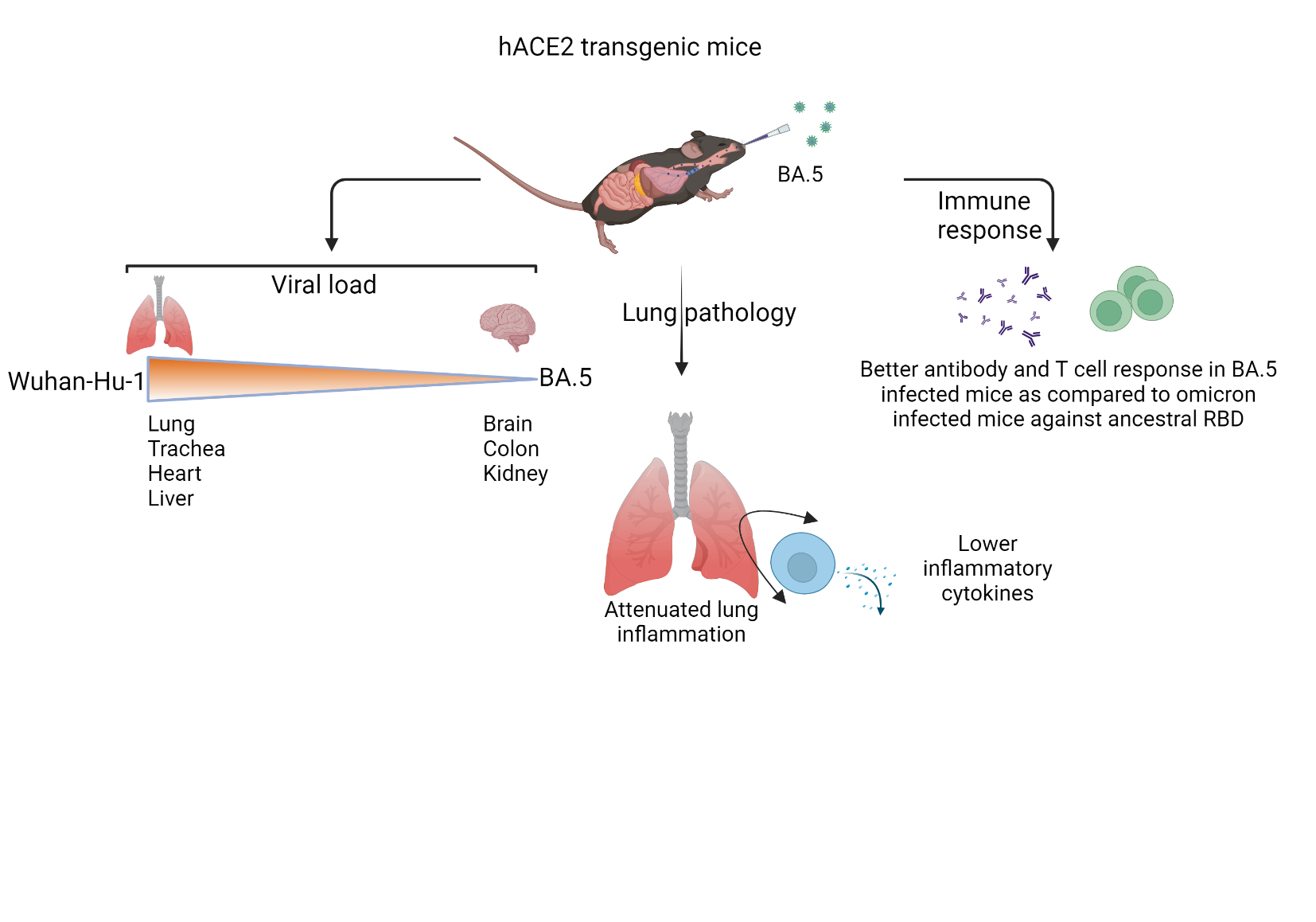 These mice express human ACE2 receptor which supports virus entry and replication in the lungs of infected mice. The infected hACE2 transgenic mice show acute lethal pathology when infected with SARS-CoV-2 ancestral Wuhan-Hu-1, mimicking severe cases of COVID-19. When BA.5 was infected in these mice, there was no mortality observed and the lungs of the infected mice showed milder pathological symptoms suggesting lower severity. In addition, the inflammatory cytokine in the lungs that is responsible for lung injury was also lower in case of BA.5 infection. Interestingly, the viral load in other vital organs such as Brain, Colon, and Kidney were higher in BA.5 infection as compared to Wuhan-Hu-1 infection. Another important outcome of the study was that the mice infected previously with Omicron and re-infected with BA.5 did not show any pathological signs. Suggesting that the individuals previously exposed to Omicron remain protected against BA.5 infections. Taken together, our study provides immunopathological findings that would be helpful in understanding the BA.5 infection and immunological response.