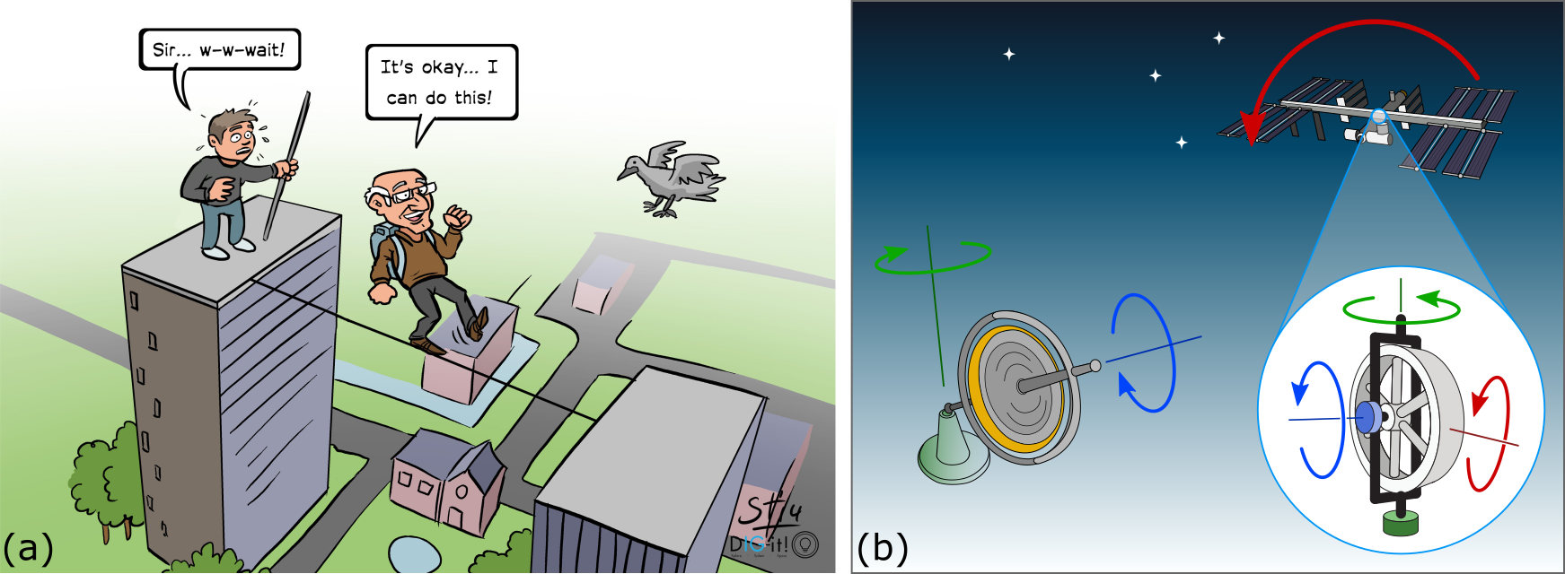 Inspiration came from space: satellites are able to change orientation in space without exerting forces or moments against the environment (Figure 1b). Moments can be exerted on the spacecraft (or human body) by modifying the angular momentum of internal flywheels, thereby inducing or preventing rotation as desired. One efficient method of doing this exploits a dynamic principle called the gyroscopic effect, which can be observed in spinning tops that resist the effect of gravity (Figure 1b). Our balance-assisting backpack, therefore, could contain such a spacecraft actuator to keep the human body in an upright and stable posture.