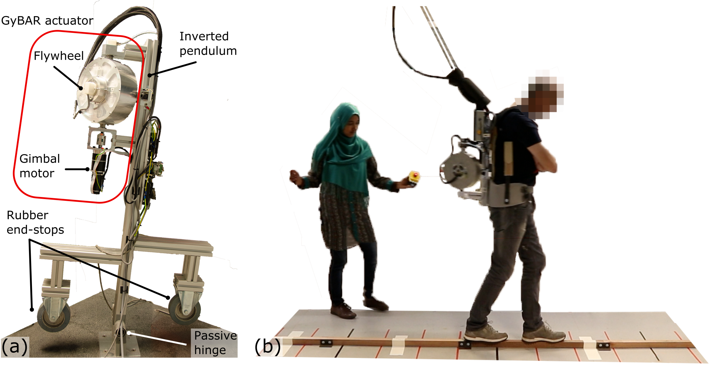 To design an initial proof-of-concept prototype backpack, called the GyBAR, we assumed a person would fall like a passive inverted pendulum to enable us to scale the actuator appropriately and devise a posture-regulating balance controller (Figure 2a). However, this posture-dependence posed a practical problem when transitioning to human subjects: humans are not rigid pendula and do not always maintain the same posture at static equilibrium. This led us to experiment more openly with other simple controllers, including those that would not balance an inverted pendulum. For example, one controller emulated viscous damping that would slow the rate of falling, similar to moving through water, but not restore an upright posture. To our surprise, this was very effective at stabilizing human subjects tasked with standing or walking on narrow beams (Figure 2b). Furthermore, the amount of assistance was far smaller than initially estimated to be necessary.