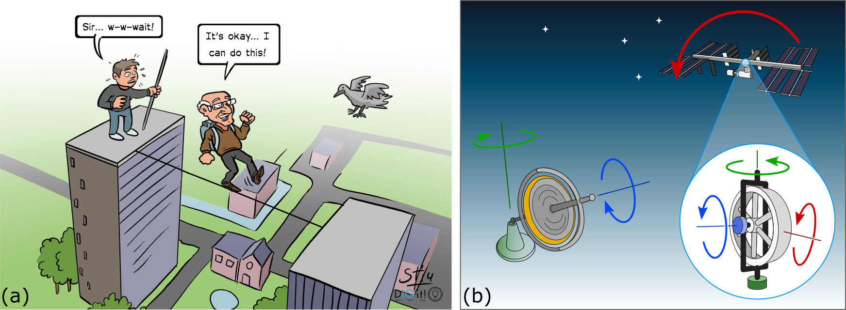 Inspiration came from space: satellites are able to change orientation in space without exerting forces or moments against the environment (Figure 1b). Moments can be exerted on the spacecraft (or human body) by modifying the angular momentum of internal flywheels, thereby inducing or preventing rotation as desired. One efficient method of doing this exploits a dynamic principle called the gyroscopic effect, which can be observed in spinning tops that resist the effect of gravity (Figure 1b). Our balance-assisting backpack, therefore, could contain such a spacecraft actuator to keep the human body in an upright and stable posture.