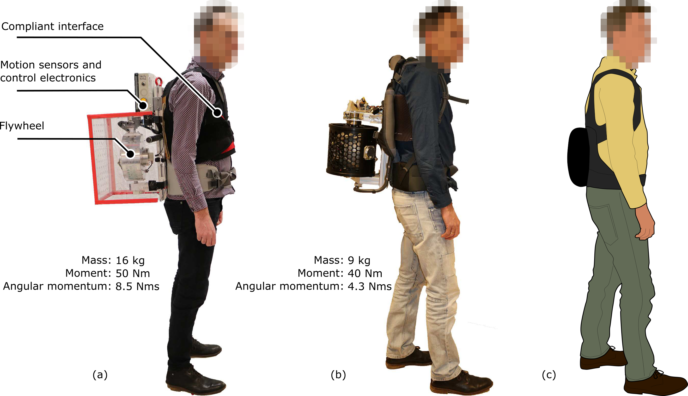 Our ideal mobile balance aid would be hands-free and practical: compact, suitable for a wide range of environments, easy to don and doff, and not inhibit normal limb movement. It could even take the form of a backpack without further cables or structures around the body (Figure 1a)! But how?