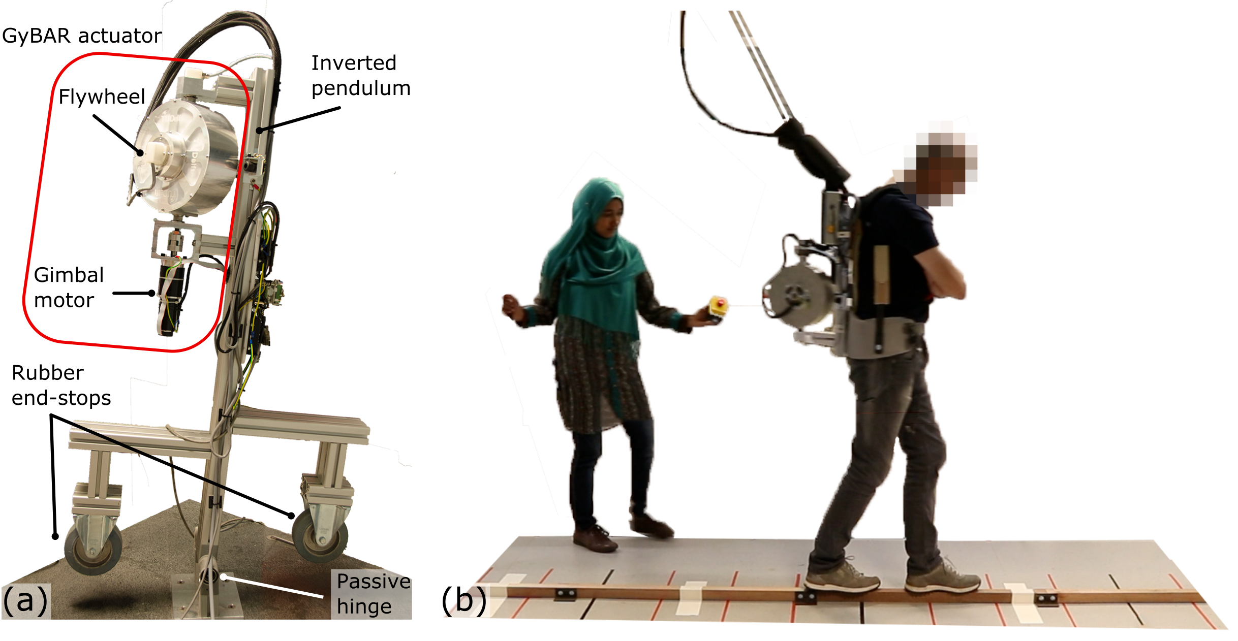 To design an initial proof-of-concept prototype backpack, called the GyBAR, we assumed a person would fall like a passive inverted pendulum to enable us to scale the actuator appropriately and devise a posture-regulating balance controller (Figure 2a). However, this posture-dependence posed a practical problem when transitioning to human subjects: humans are not rigid pendula and do not always maintain the same posture at static equilibrium. This led us to experiment more openly with other simple controllers, including those that would not balance an inverted pendulum. For example, one controller emulated viscous damping that would slow the rate of falling, similar to moving through water, but not restore an upright posture. To our surprise, this was very effective at stabilizing human subjects tasked with standing or walking on narrow beams (Figure 2b). Furthermore, the amount of assistance was far smaller than initially estimated to be necessary.