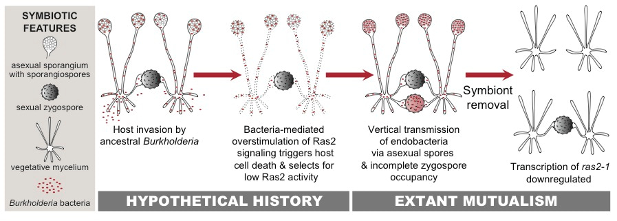 But why would bacteria gain full control over fungal asexuality and only partial control of sexuality? We think that the explanation lies in theory of how mutually beneficial interactions evolve. The Rm-Burkholderia interaction most likely started out as an unfriendly one, with bacteria acting as parasites of the fungus. However, once the ancestral parasitic Burkholderia could gain control of their own transmission, it would turn them from a foe into a friend (something evolutionary biologists refer to as a ‘parasitism-mutualism shift’). Our work indicated that gaining partial control over sexuality coupled with complete control of asexuality was enough to facilitate the evolution of a beneficial interaction from an antagonistic one. On the other hand, if the zygospores that did not inherit bacteria were unable to germinate, we could actually say that control over fungal sexuality was complete. But we can’t say that yet, because Rhizopus zygospores are remarkably difficult to germinate in the lab…