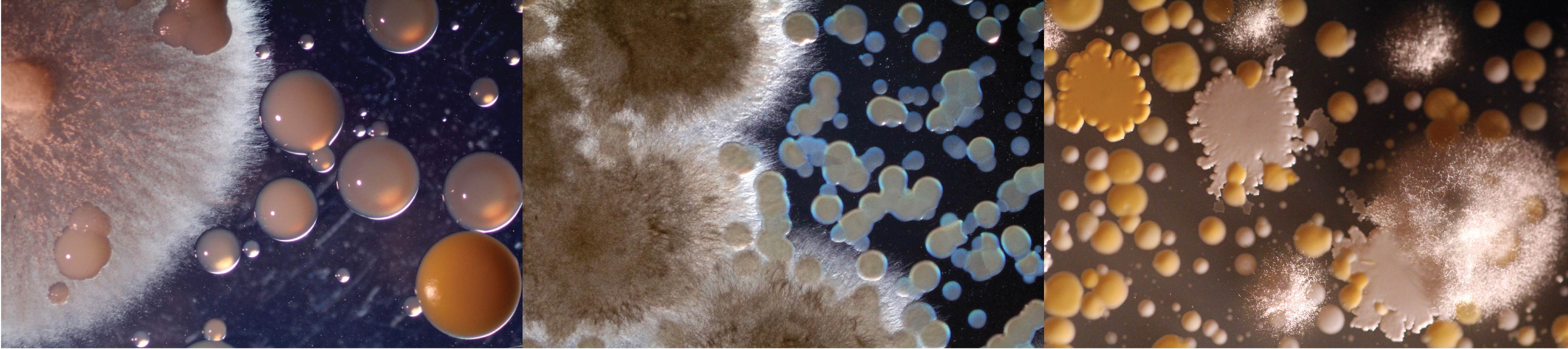 We were taking images of microbial communities isolated from cheese rinds as part of a collaboration with a cheese professional and a photographer. Our goal with this collaboration was to highlight the diversity of cheese rinds based on how their microbes appear when grown in the lab. We had plated out the microbes from a large range of cheeses onto Petri dishes and microbial colonies appeared. A sampling of some of these photos can be found below.