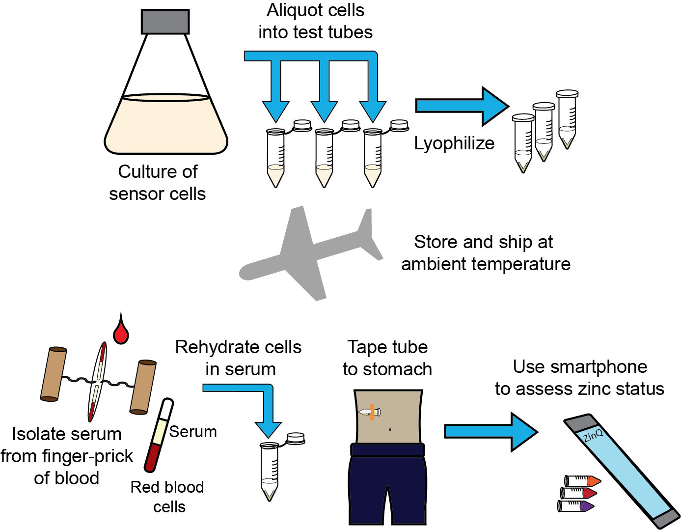 In our recent Nature Communications paper, we demonstrate the potential to further bridge the gap between sensors that work in the lab and ones that could actually be used in the field. We made a field-deployable biosensor for zinc deficiency, which causes over 100,000 childhood deaths each year and is most prevalent in remote, low-income regions that have no well-equipped laboratories or clinics, and in some places not even electricity. A low-cost, minimal-equipment test for zinc could help improve assessment and treatment of this problem.
