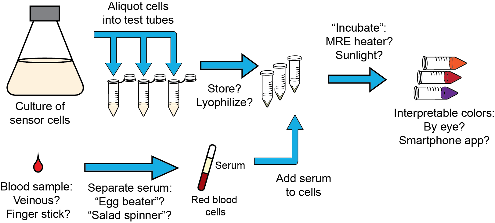 Figure 1: Our initial vision for test manufacture and minimal-equipment interpretation, with uncertainties in implementation indicated.