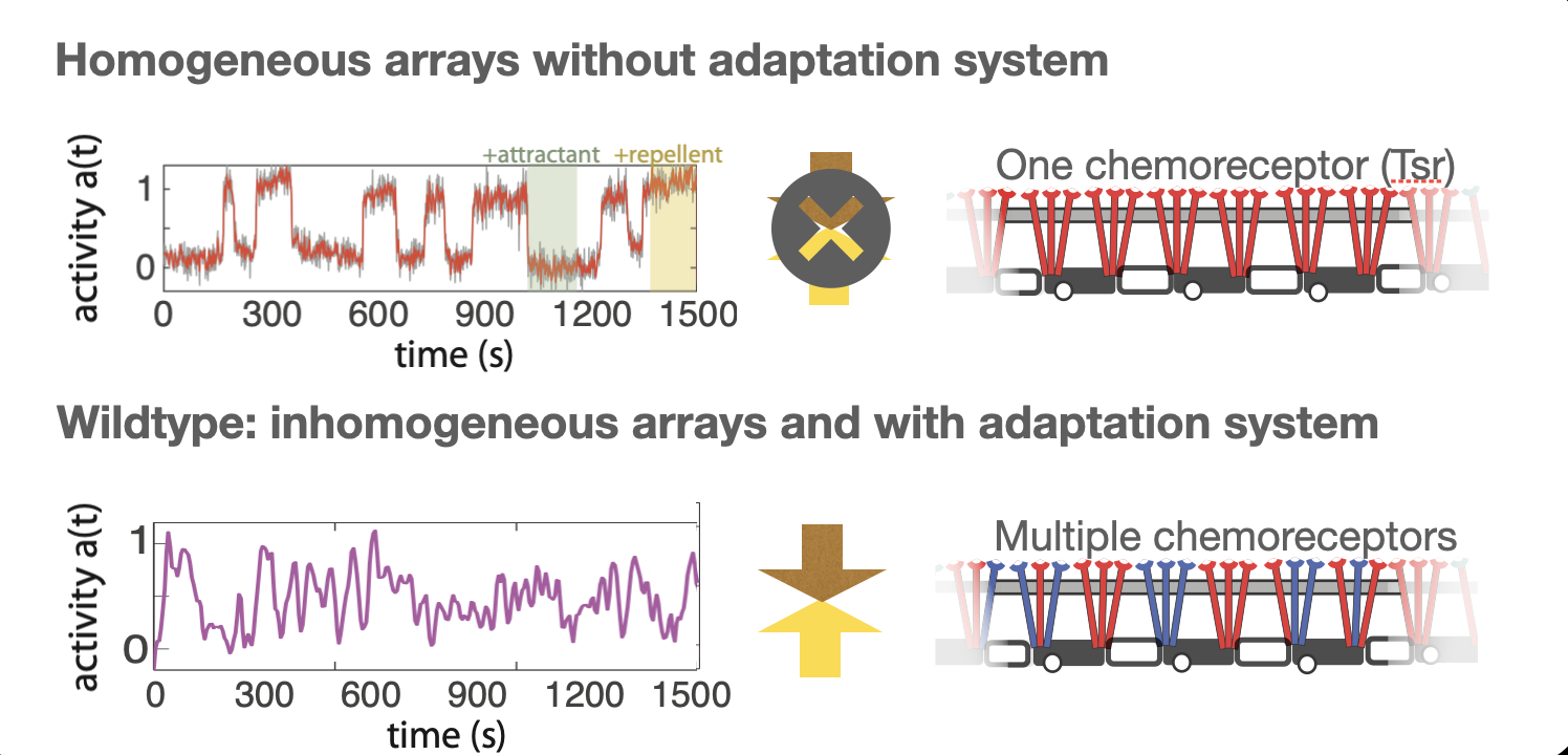 Since we placed our work on the archive a few years ago, the stochastic two-state switching has already inspired others to work on different models to explain the data, with one key advance being that the models do not assume an equilibrium model (as our standard Ising model is) but instead have a model that explicitly includes dissipation in the chemosensory arrays. These models can actually explain one difference between the model and our data that we could not explain (it is the asymmetry that the cells switch slightly faster going up in activity compared to going down) 5. It has been very rewarding to see these developments and we hope that our improved understanding on this system will also provide insights and inspiration for other protein complexes, of which there are many across cell biology.