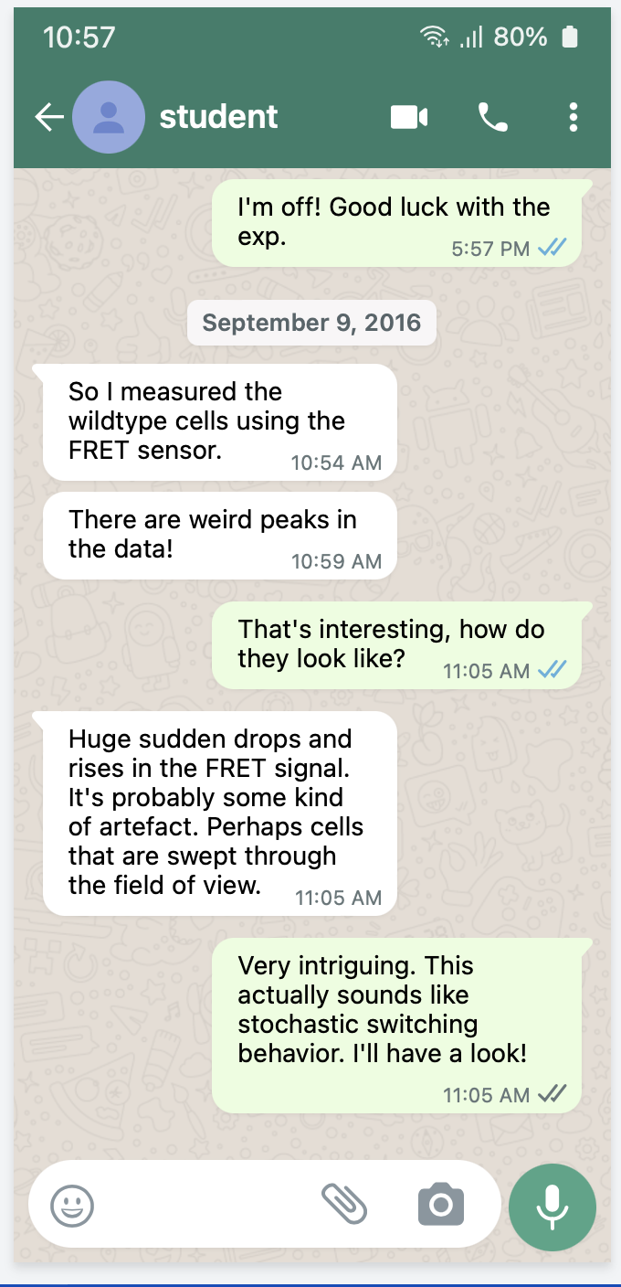 In the summer of 2016 we were joined by a summer student, Francesca van Tartwijk, who was reading natural sciences at Cambridge (and did very well). We had been chasing critical behavior in cells that had mutant receptors, in which the protein amino acid sequence was modified in only one position. Cells expressing these mutant receptors revealed very slow dynamics in a signal that was averaged over a population of cells and our collaborator Sandy Parkinson had shared them with us to see what was happening on the single cell level. It turned out these mutants did not reveal anything unexpected, so at the end of the experiment I said to Francesca “I am on holiday in Switzerland next week, you understand the method now, so you can measure wildtype as a control”. Wildtype is the name of the normal receptor, "as it occurs in nature". She did, and it turned out the wildtype had the surprises, not the mutants!