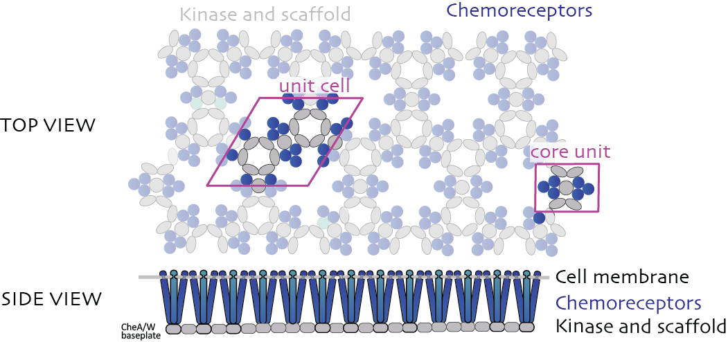 Why is this observation so striking and special? Two state fluctuations are not uncommon in biology. Most famously, ion channels are known to have binary behavior and stochastically switch between an open and a closed state. Also the bacterial flagellar motor switches its rotation (clockwise or counterclockwise). But these are relatively compact assemblies with up to a few dozen units. The chemosensory arrays are much larger, containing thousands of molecules that form one or more clusters associated with the (inner) bacterial cell membrane. Inside these clusters, the receptors are organised as hexagonal arrays together with other signalling molecules (most importantly a histidine kinase). So, a switch in these arrays means that the signal has to propagate through this regular two-dimensional array.