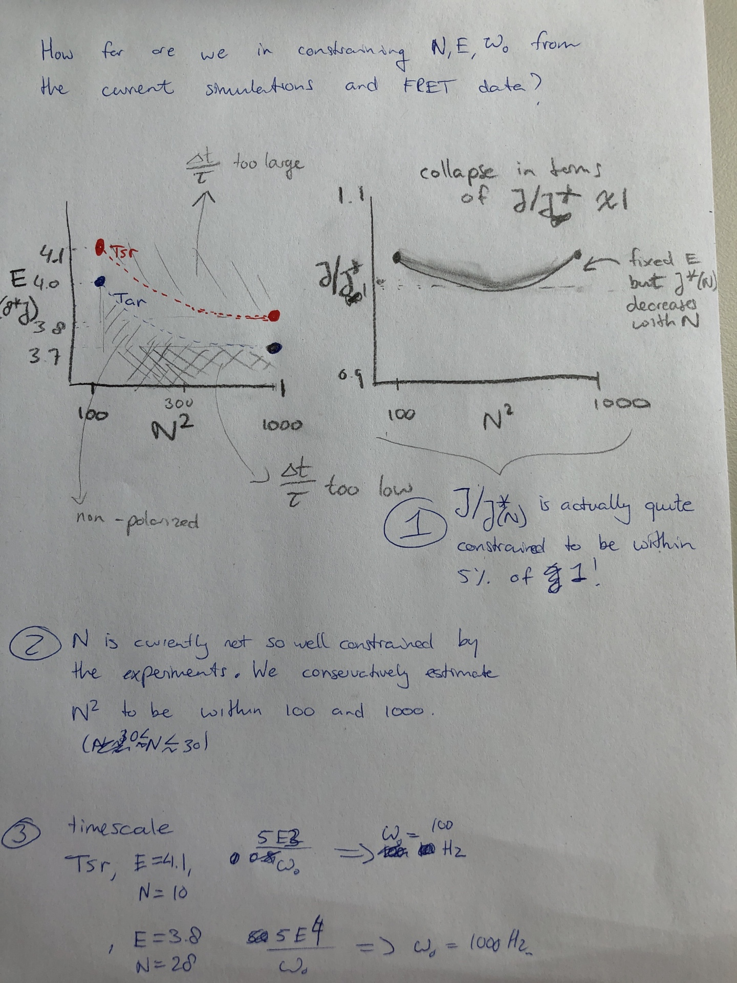 So, despite uncertainty in L, J had to be close to J* to explain the data. And from the uncertainty in L, we could then provide a range of ω0. Later Tom then thought of a clever way to constrain L based on the fact that we know there are about 10,000 chemoreceptor molecules per cell, and these are ordered in either core unit (12 molecules per core unit, meaning about 1000 core units) or a unit cell (36 molecules per unit, hence 277 core units). Hence L=17 and L=30 seemed a reasonable range. It did not affect our estimate of J, but it did further constrain our estimate of ω0.