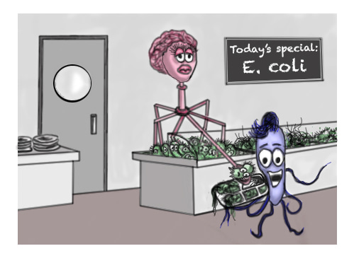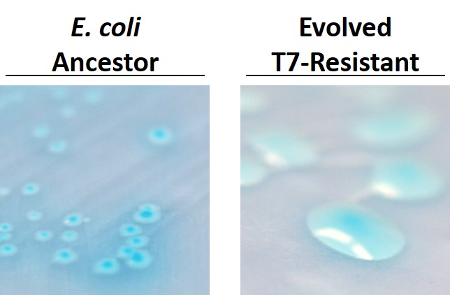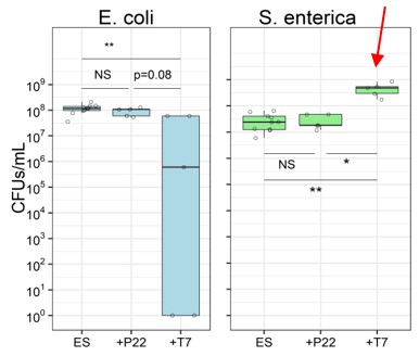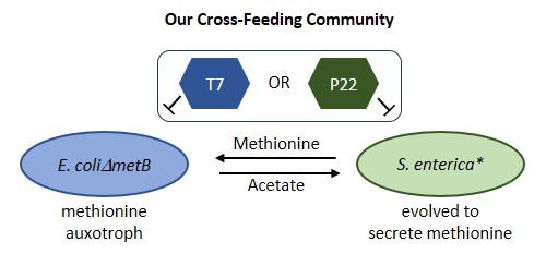 Mathematical modeling and previous work from our lab led us to predict that phage attack of either member of our cross-feeding coculture would slow community growth, but have little effect on final yields.6 Bench experiments showed that both E. coli-specific T7 phage and S. enterica-specific P22vir phage did indeed slow community growth, but there were some unexpected impacts on final yields. When E. coli was infected with T7, S. enterica reached HIGHER yields than in co-cultures without phage. The mathematical model completely missed the surprising benefit to S. enterica during T7 phage infection.