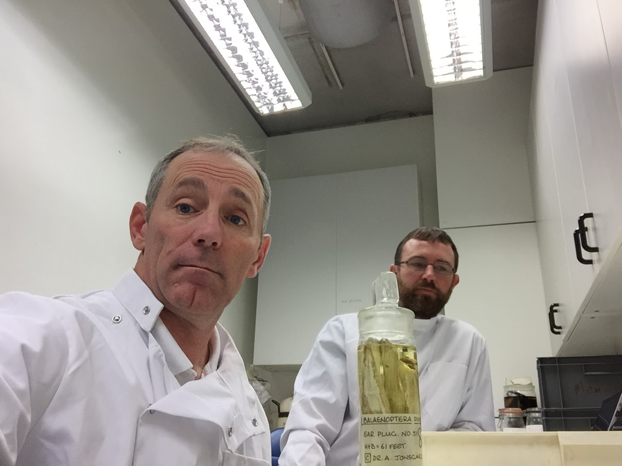 Trumble and Usenko with fin whale earplugs at the Museum of Natural History London