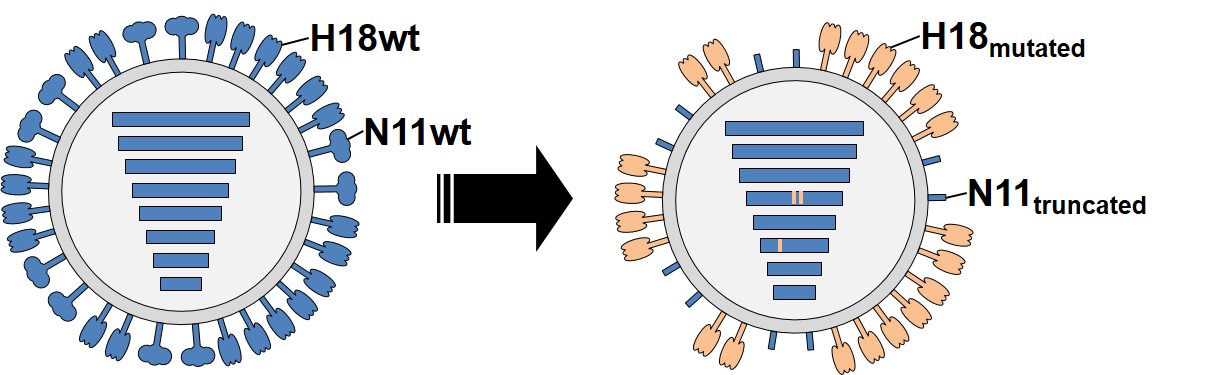 This exciting bat flu journey started with the infection of susceptible cells in tissue culture. Although simple, this experiment had far-reaching consequences. To our great surprise, we observed the rapid appearance of better replicating virus mutants that harbored mutations in the H18 hemagglutinin head and expressed a truncated N11 neuraminidase protein either by the insertion of a premature stop codon or a partial deletion of the N11 open reading frame. Fascinated by these findings, we then dug deeper into the mechanistical role of N11. We found that its function is to facilitate viral release from the cell surface by presumably downregulating MHC-II surface expression. Importantly, functional N11 was only required in context of wild-type H18 but dispensable once H18 had acquired sufficient adaptive mutations.