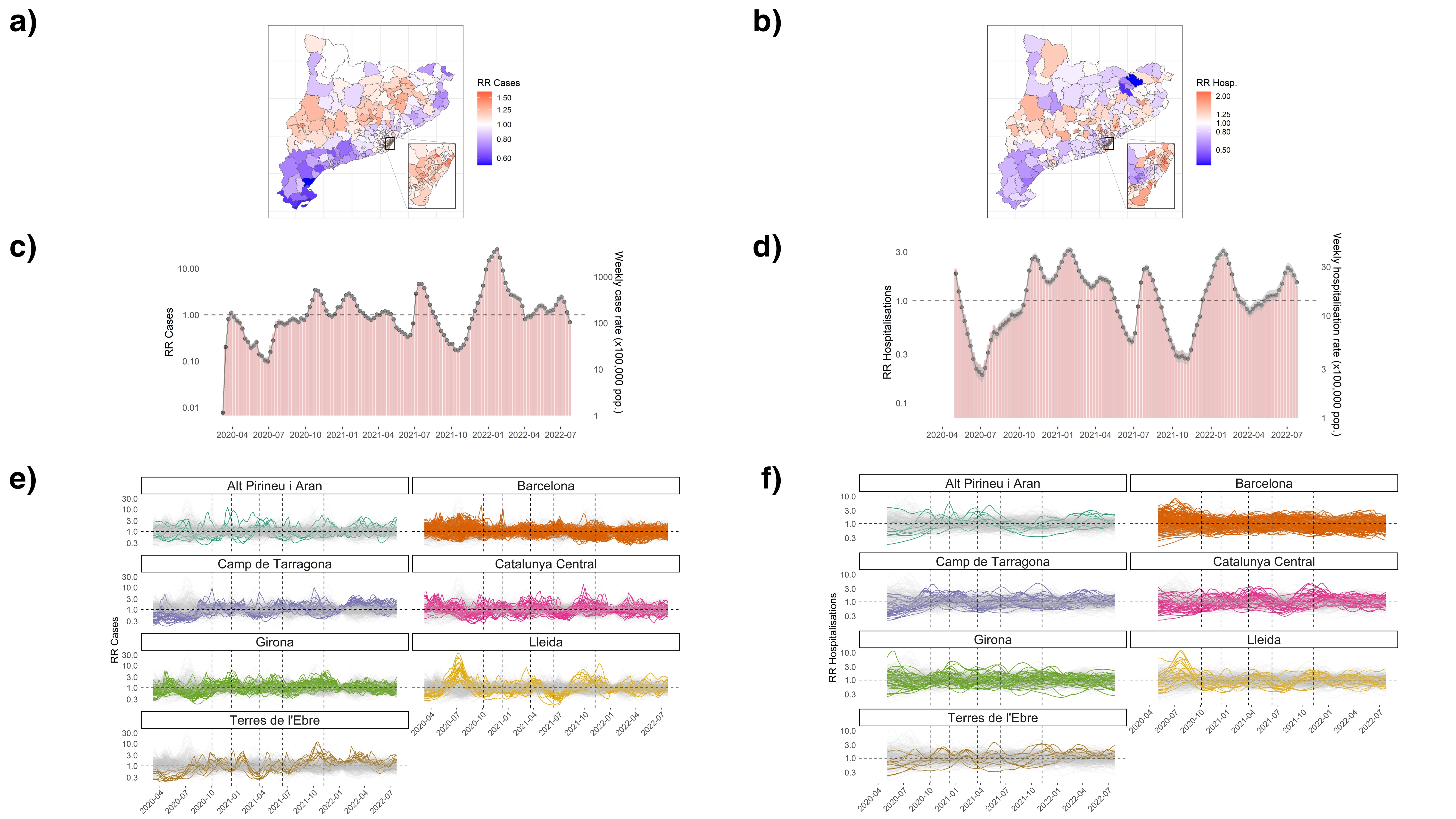 We have identified the spatial, temporal and spatio-temporal trends of the Covid-19 pandemic in Catalonia. Clustered cold and hot spots in space, time and spatio-temporal dimension were identified for both cases and hospitalisations (Fig. 3). The lack/excess of risk for each area, compared to the general population on average over the whole population is represented in Fig.3a and b (spatial RR). The lack/excess of risk for the general population of one week compared to the average for the whole period is represented in Fig. 3c and d (temporal RR). Finally, how areas deviate from the overall temporal trend of the general population at many different points in time is represented in Fig. 3e and f (spatio-temporal RR).