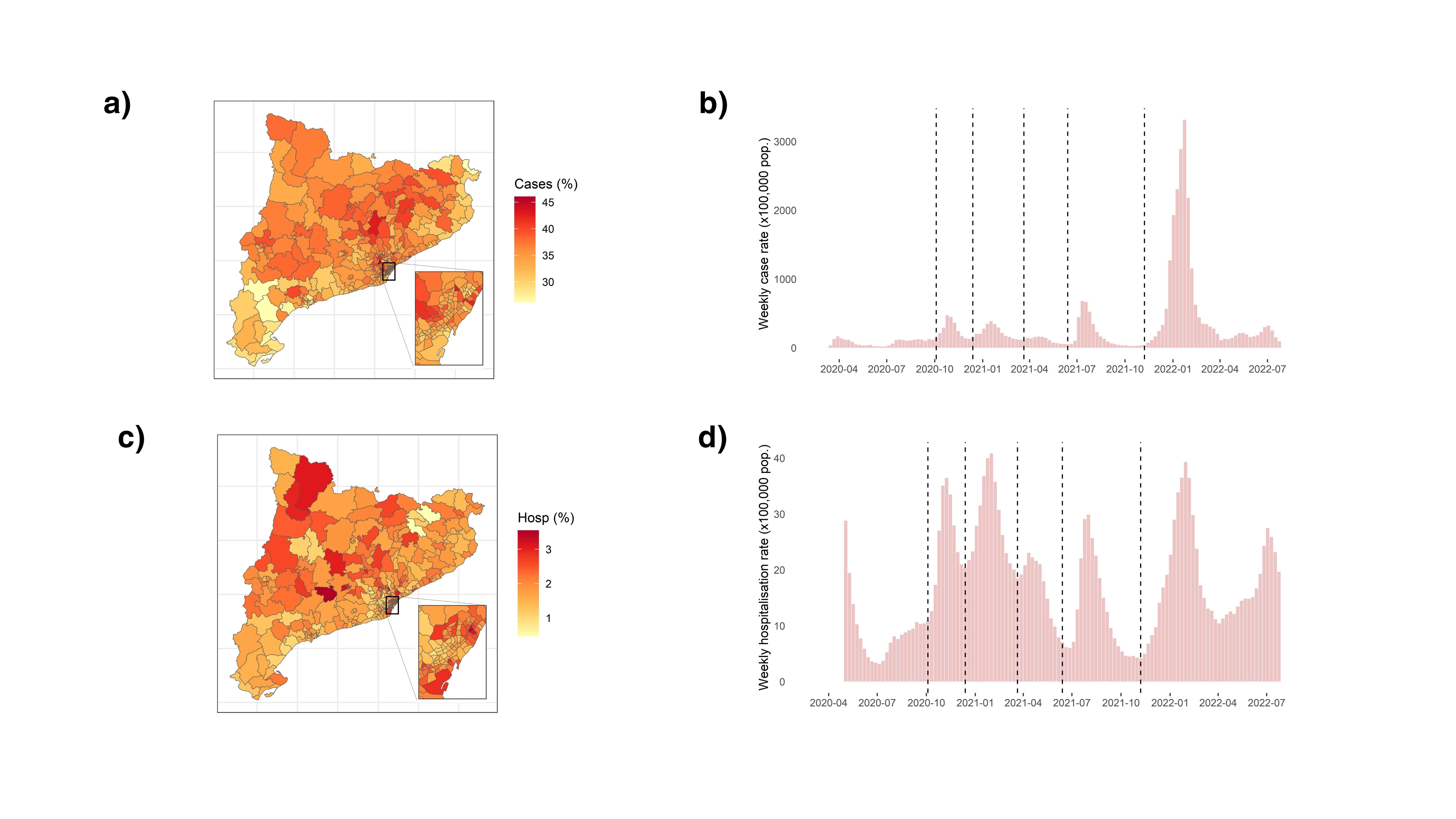 During the study period, a cumulative total of 2,685,568 COVID-19 cases and 144,550 hospitalisations were reported in Catalonia, representing a 35% and a 1.89% of the total population. In Fig. 2b and d the evolution of weekly cases and hospitalisation rates (×100,000 population) in Catalonia over the whole study period is represented. The vertical dotted lines represent the start of each of the six waves, which were very different in shape, especially for cases. Considering all the pandemic period, the proportion of the total population infected ranged from a minimum of 26% in some areas to a maximum of 46% in others, while the proportion of the total population hospitalised ranged from 0.5% to 3.5%