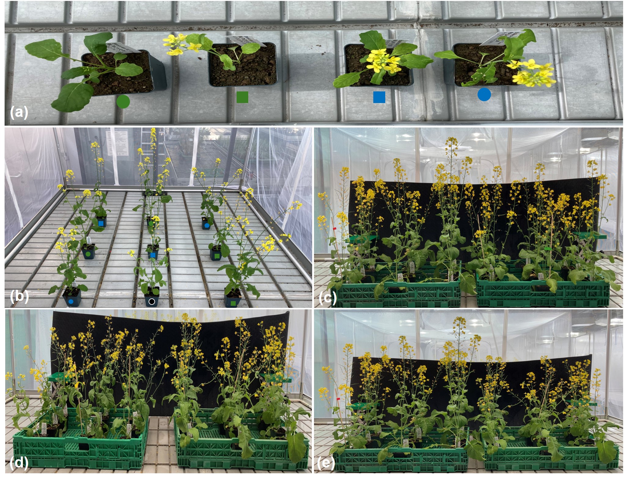 Figure 3. Impact of bee-pollination and aphid-herbivory on plant evolution. (a) Differences in morphology and phenology between treatments in early development. (b) Example of bee-first choices matrix including each plant line. In figures (a) and (b), different colors represent the different soil treatments (blue: limestone soil, green: tuff soil, black: generation one), while different shapes indicate different pollination treatments (circle: bee-pollination, squares: hand-pollination). (c) Differences in morphology in tuff line plants with bee-pollination when evolving without herbivory (left) or with herbivory (right). (d) Differences in morphology in limestone line plants with bee-pollination when evolving with herbivory (left) or without herbivory (right). (e) Differences in morphology in bee-pollination and non-herbivory line plants that evolved in tuff (left) or in limestone (right).